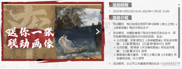 除了太和殿外,《洛神赋图卷》、《关羽擒将图轴》这两幅传世名画也成为了游戏中武将的画像,玩家只需要在游戏中完成联动活动,收集对应的纪念卡,即可免费领取对应奖励。