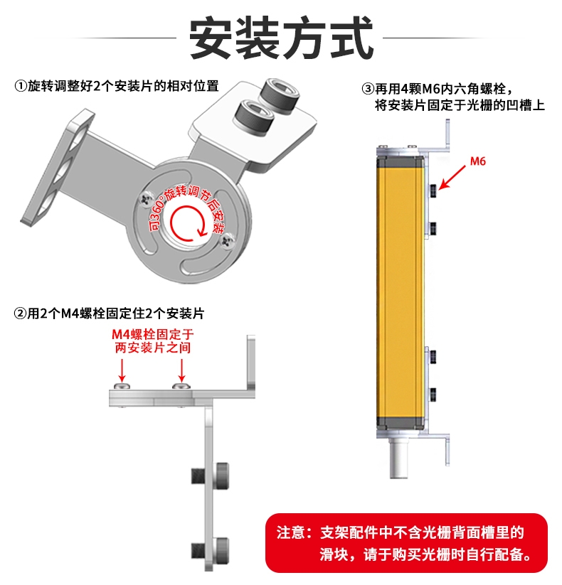 需要特别注意的是,支架配件中不含光栅背面槽里的滑块,用户需在购买光栅时自行采购配备,这一细节提示也体现了神护电子严谨的服务态度。此外,两款支架均配备标准化标配配件,无需额外采购,进一步降低用户的使用成本,提升使用体验。从产品尺寸来看,SF、KF型支架均采用紧凑设计,体积小巧,安装后不占用过多空间,不会遮挡设备操作视线,完美适配紧凑工位的安装需求。