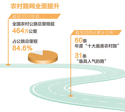 一个个“最美”,交织成“大美”。经过多年努力,我国农村公路覆盖广度、通达深度显著提升。截至2024年底,全国农村公路总里程超464万公里,占公路总里程的84.6%,长度可绕地球赤道115圈。“外通内联、通村畅乡、客车到村、安全便捷”的农村交通运输网络和服务体系,带动农村地区整体面貌发生巨变。