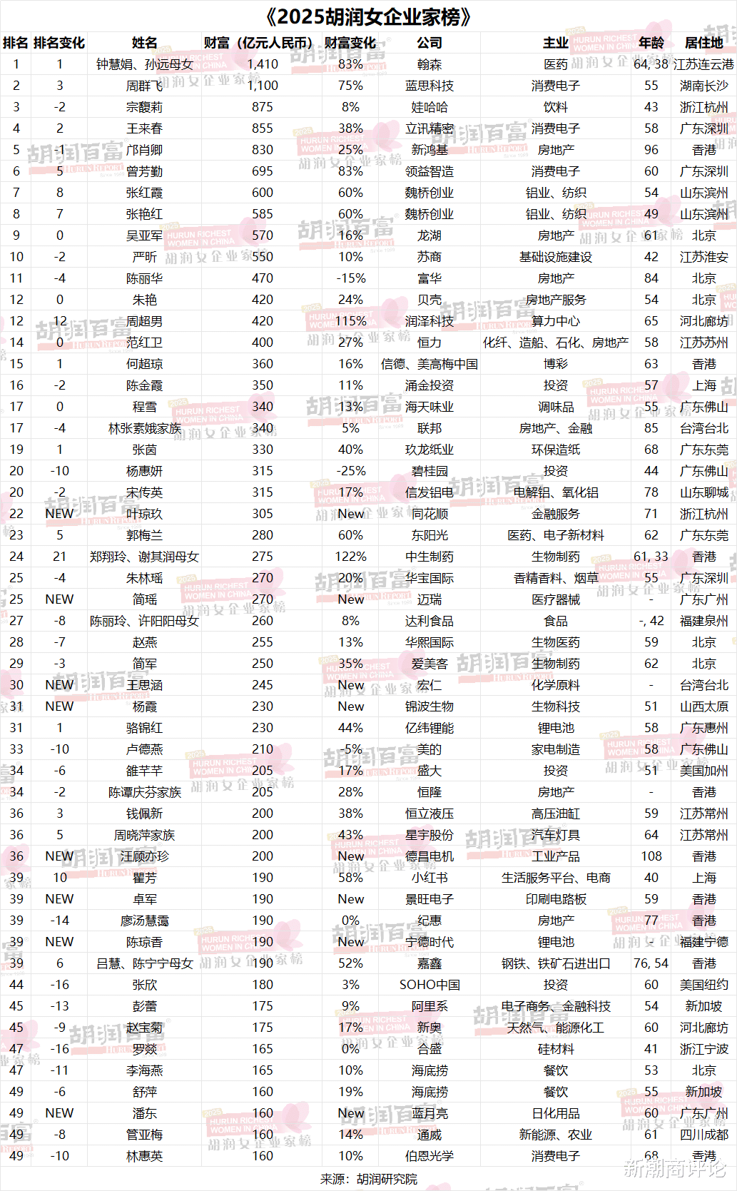 虽然男性富豪依旧占据主导地位,但巾帼不让须眉,中国涌现出越来越多的优秀女性企业家。根据胡润研究院发布的《2025胡润女企业家榜》显示,今年年榜单入围门槛增加40亿元(涨幅33%)至160亿元。总财富达到1.9万亿元,较去年提升32%,较10年前则实现翻倍增长。