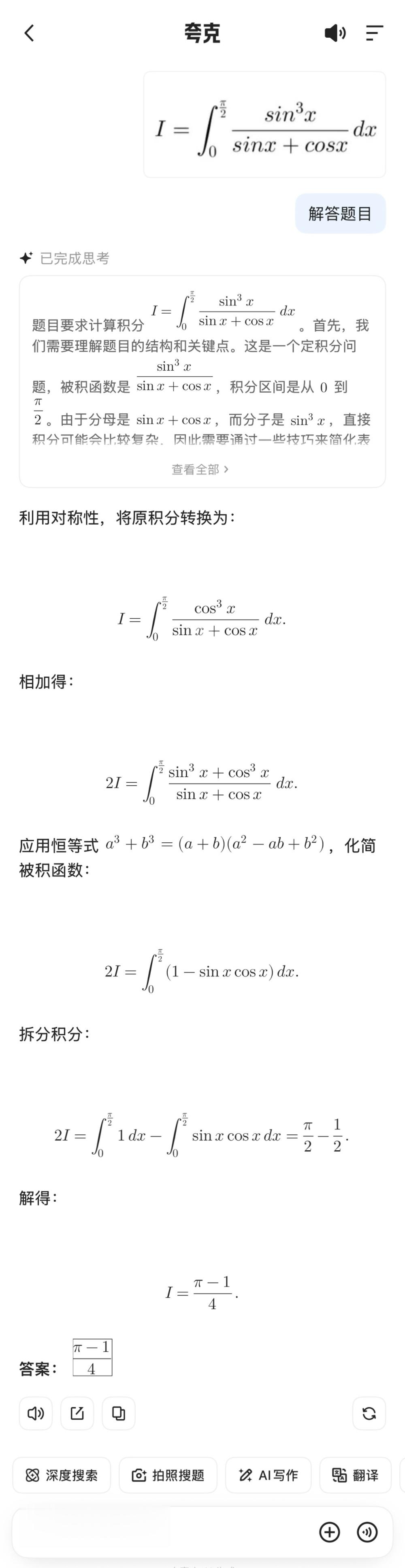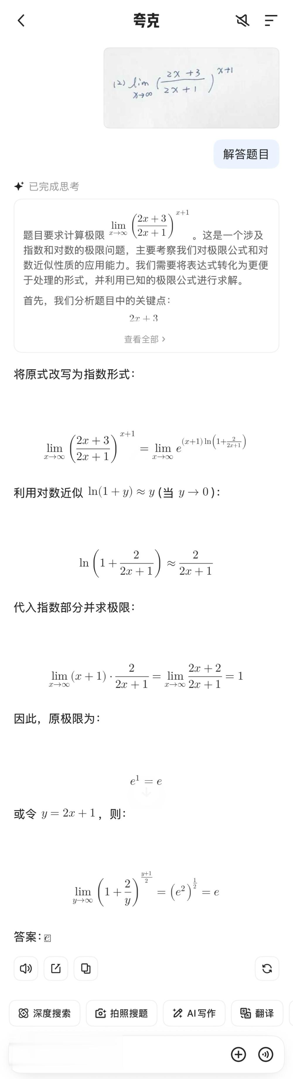 三类题目均可准确识别。数学题中还能自动分步解析计算过程,符号与解题逻辑均无误,响应时间也较快。从目前表现看,这部分能力既继承了夸克原有的题库,还结合了AI的图文理解。