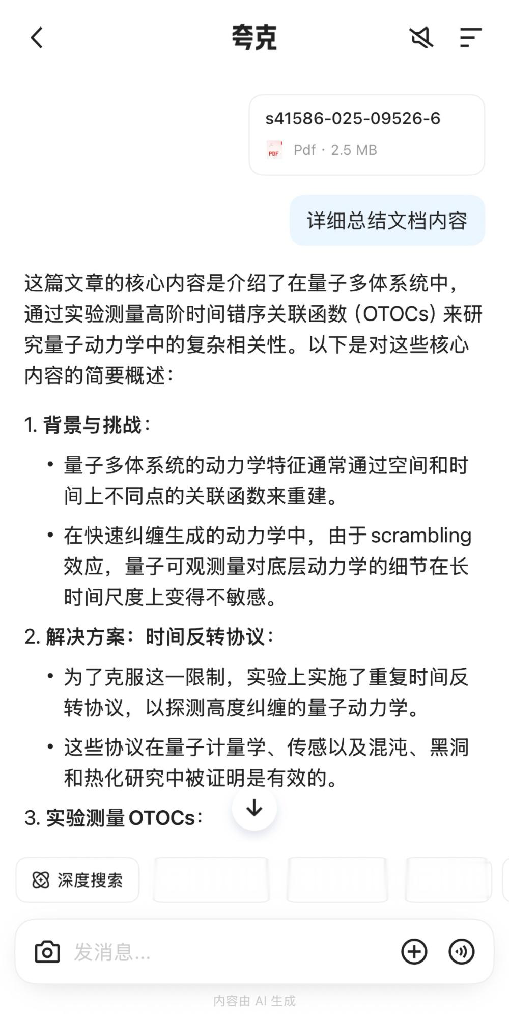 文件解析并不算是新鲜难题,但既然夸克把“文件阅读”放在了对话助手的功能栏前排,我们也尝试了一番。我们上传的是一篇谷歌刚刚登上Nature的量子计算论文。助手成功识别全文内容,从回应内容来看,它对科研类英文长文具备基本理解能力,适合用于初步梳理与翻译参考。