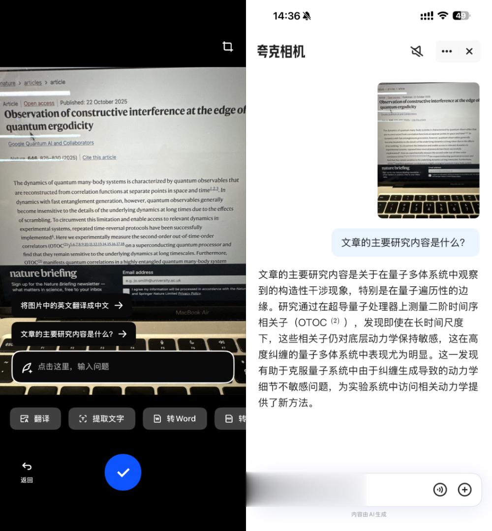 我们也体验了“夸克相机”功能。将摄像头对准电脑屏幕上的一篇英文科技论文,“夸克相机”迅速识别出文中内容,并在底部弹出两个快捷指令:“将图片中的英文翻译成中文”“文章的主要研究内容是什么”。点击后,助手生成了一段相对完整的中文摘要,涵盖了研究主题、实验方法与理论意义等关键信息。