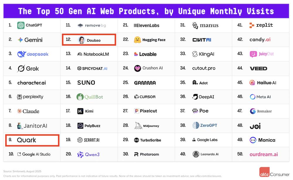 此前夸克凭借拍照搜题、扫描等功能,已经吸引了学生等高频使用人群。在今年a16z评选的全球Top100消费级生成式AI应用榜单中,夸克位列第九,与豆包(第十二)一道跻身前二十名。