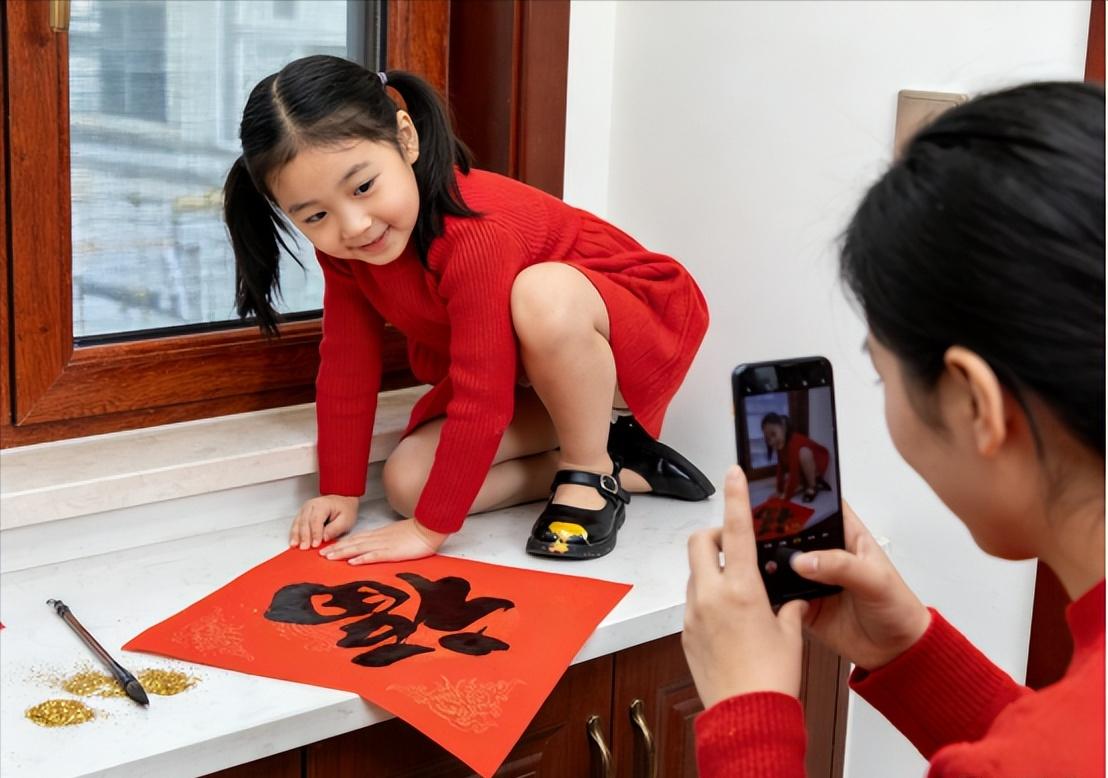 用旧笔记本、废彩纸、贴纸做“新年故事册”,翻手机里的新年照片逐一提炼细节:贴“贴春联”照时问“你递胶带时说‘爸爸举高点’,对不对?”;贴“年夜饭”照,让娃给家人画对话气泡,比如给奶奶画“多吃鱼,年年有余”。