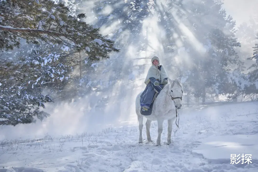 再次,电影质感的镜头设计,既有仪式感,又有神秘、恢弘的诗意。全片第一个镜头,先声夺人。茫茫空荡的雪景之下,主人公牵着骆驼从右向左入画。行色匆匆的身影与远处的雪山、森林融为一体,一动一静,充满层次感。大面积的留白构图,贴合“至上之白”的主题,又营造出中国山水画的意境。