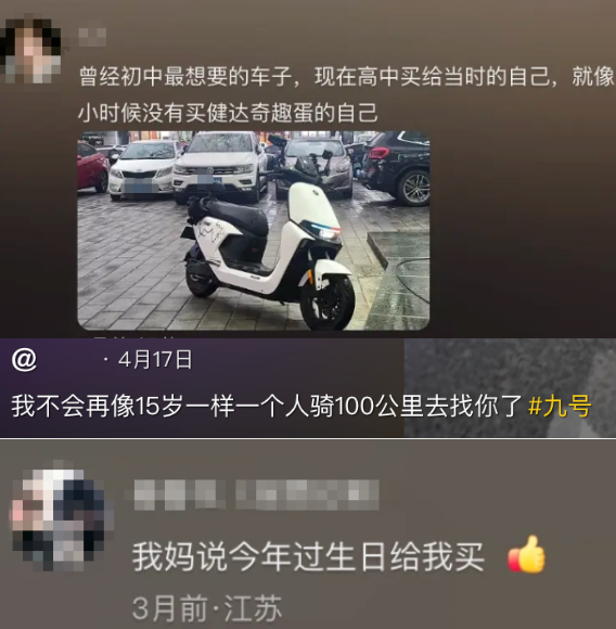 毕竟刷刷社交媒体你就会意识到,对于不少十几岁的,甚至还不可以上路骑行的少年而言,拥有一辆属于自己的九号电动车,其所产生的成就感,完全不逊于“不到30就开上了兰博基尼”。