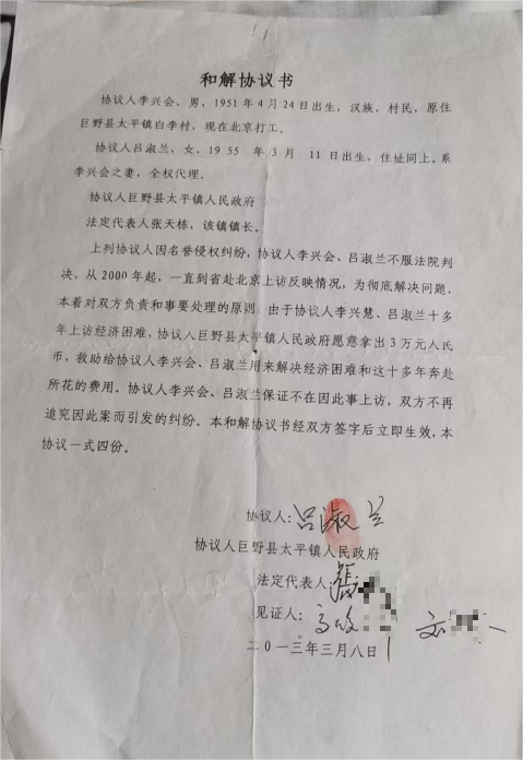 2013 年 3 月,太平镇政府与吕淑兰签订了一份和解协议,以 3 万元救助金的形式,用于解决其多年诉求产生的经济困难及相关开销,同时约定吕淑兰不再就名誉侵权相关事宜进行诉求。然而,这 3 万元并未解决房屋被拆、土地被占等核心问题。近十年过去,新旧问题叠加,始终悬而未决。