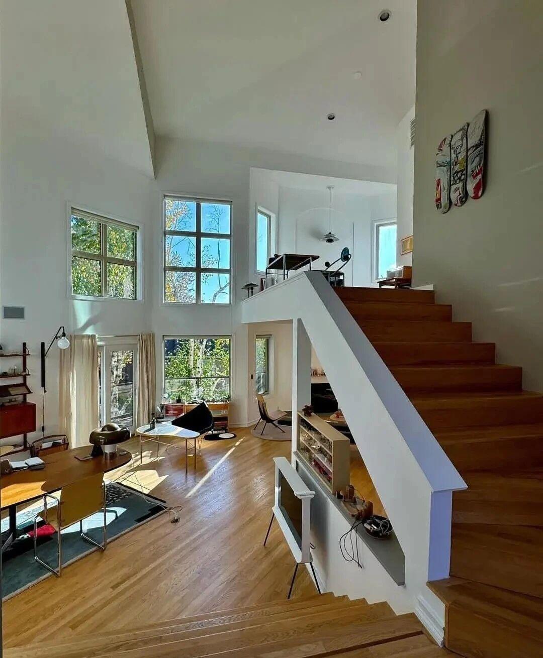 墙壁、天花,扶手全部都是白色的,而且调高位置也没有做明显的隔断,在视觉上更显敞亮,上部还安装了超大的窗户,搭配绝美窗景,大方又别致;