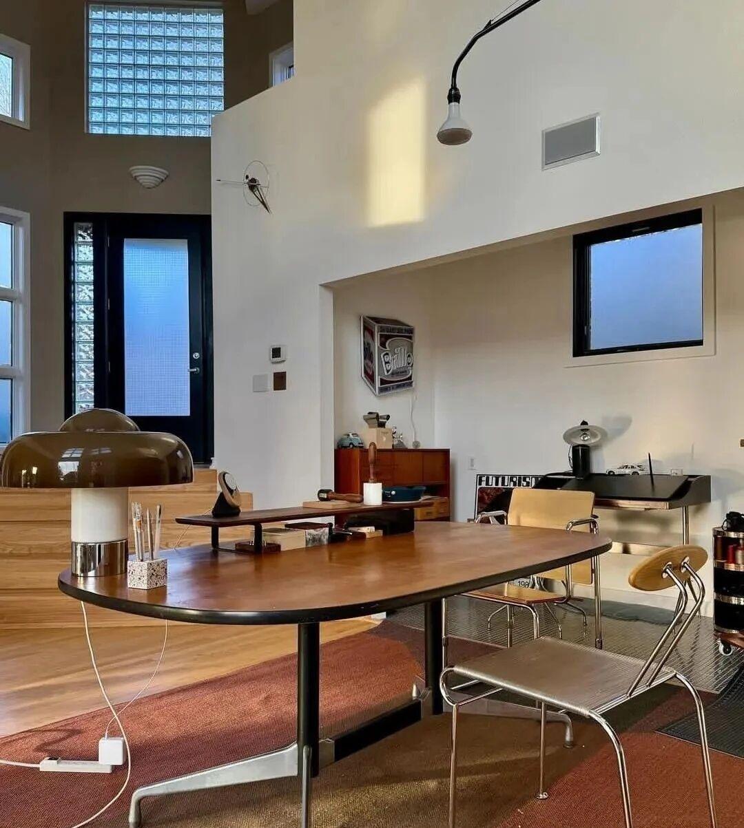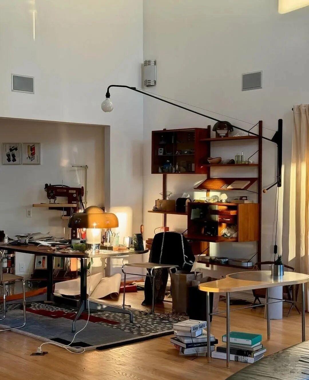 客厅最高级的一个设计,或许就是软装了,博爱特别选择了一张异形大长桌,配黑色球形台灯,这就是博主日常阅读、办公的地方;