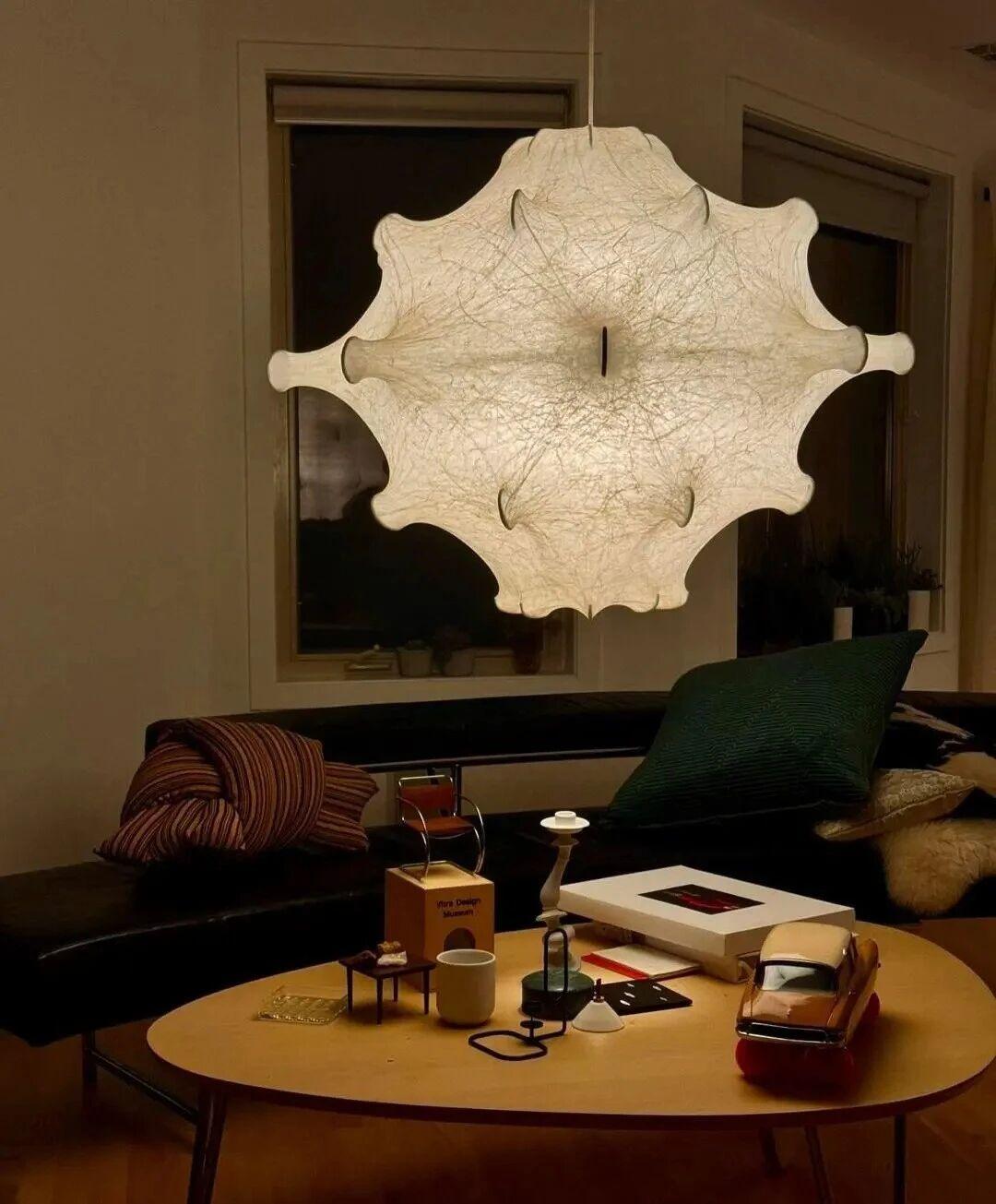 灯光布置得也很美,床头柜摆着一盏白色球形台灯,天花板安装飞碟造型的吊灯,搭配床尾的银色球形落地灯,灯光亮起,温馨舒适,氤氲缕缕惬意。