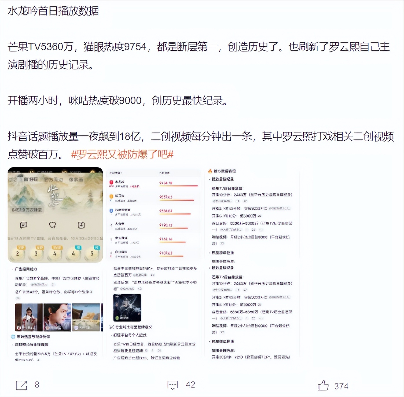 《水龙吟》开播后,罗云熙直接刷新自己主演剧播出的历史记录,芒果TV5360万,猫眼热度9754,都是断层第一,在这样的情况下,《暗河传》想要脱颖而出,确实有些困难,但也有一定的可能。