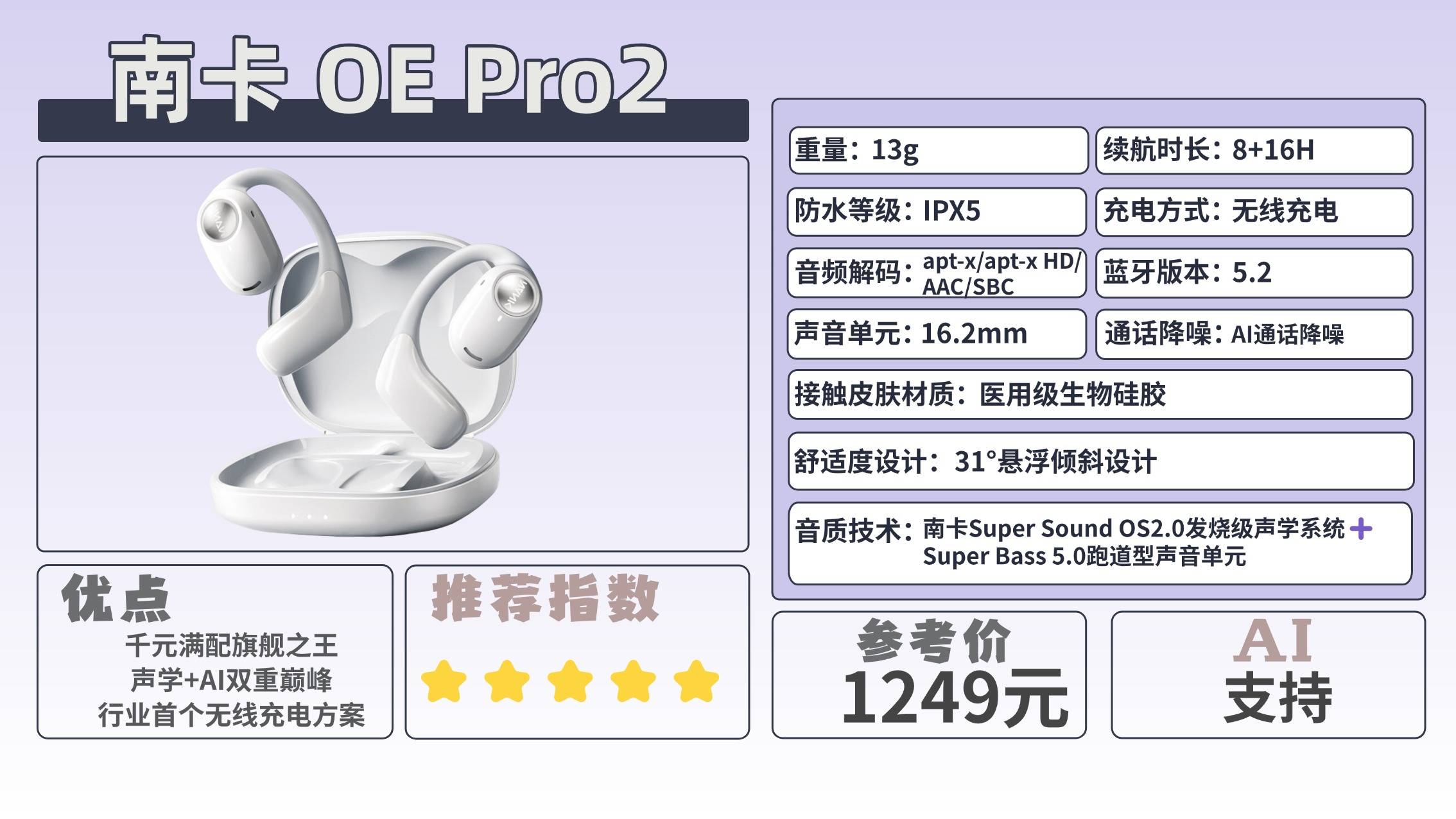 作为一家深耕音频领域的专业品牌,南卡一直以音质与舒适度为王,OE Pro2更被称为该品类中“最能打”的代表。在两千元内的价格区间,它凭借自研单元、先进声学系统和完善的配置体验,展现出远超同级的实力,赢得HiFi发烧友和媒体的高度认可。