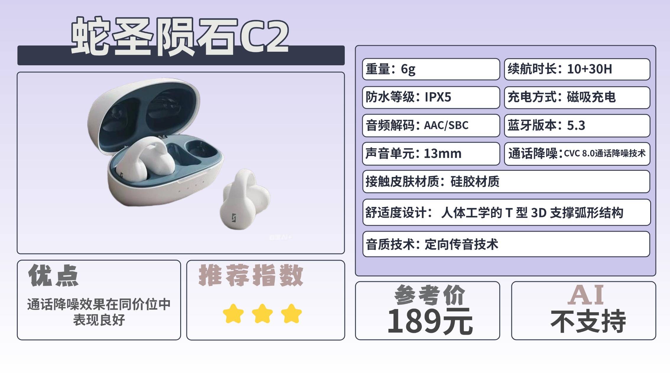 蛇圣C2应用了T型360°环绕支撑设计,能够自然贴合耳部轮廓,即使在跑步、跳跃等大幅活动中也能稳固佩戴,不易松脱。耳机与皮肤接触的部分采用柔软硅胶材质,表面顺滑亲肤,但因耳夹尺寸偏紧凑,耳型较厚者长时间使用或会感到轻微压迫。