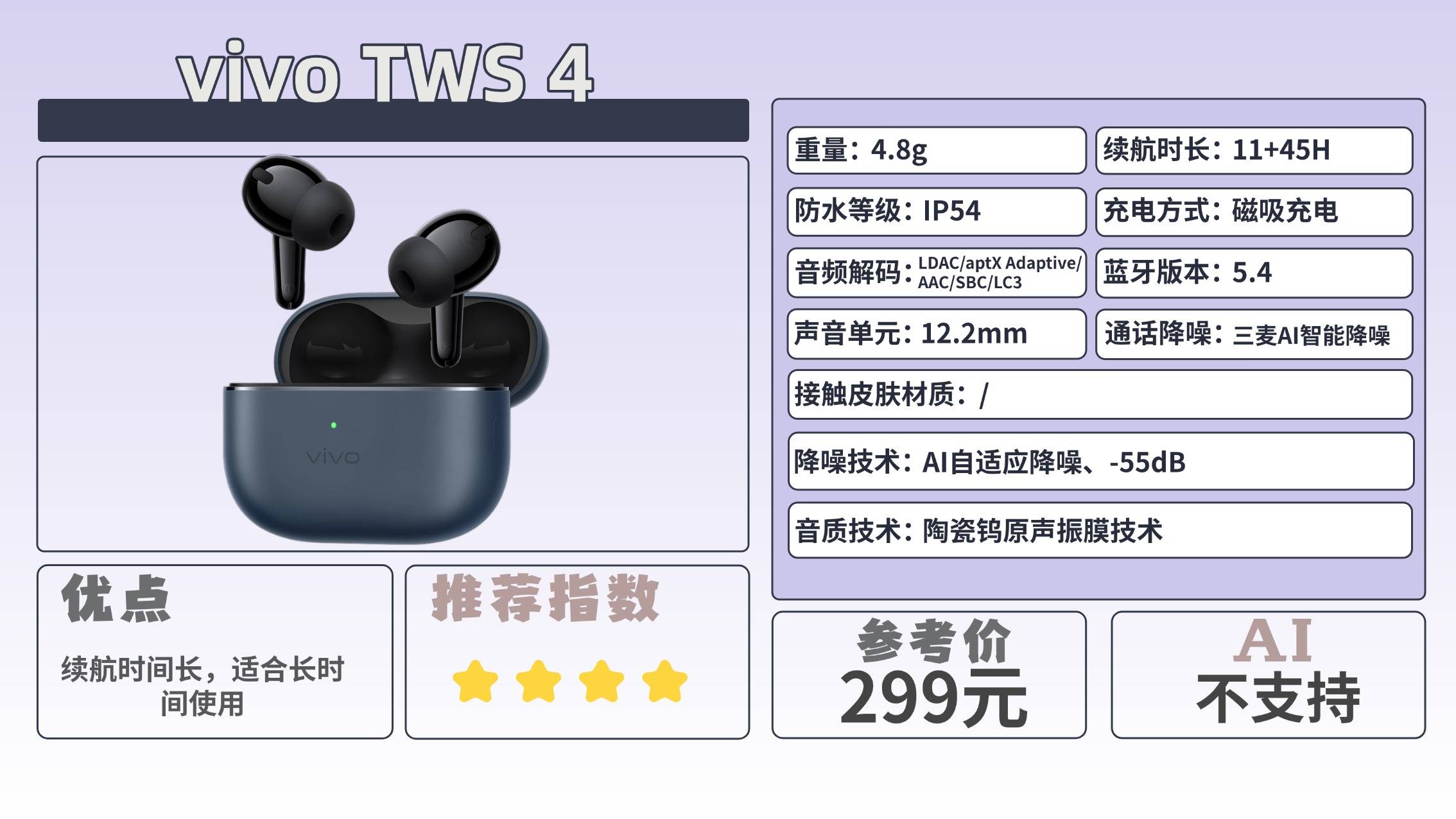 总的来说,vivo TWS 4在音质呈现、主动降噪、续航能力与佩戴稳固性上均有全面表现,能够兼顾通勤、办公、娱乐及运动等多种使用情境,是一款综合性能出众的高端入耳式耳机。