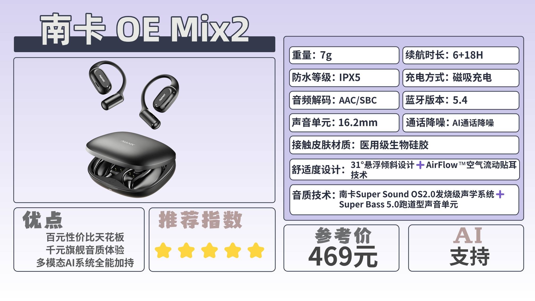 在音质方面,南卡为了追求极致表现,特意建立高规格开放式声学实验室,一款产品可反复打磨多年,迭代超过20个版本,优化100多个性能细节,只为达到最佳音质表现。OE Mix2搭载Super Bass5.0高性能声学单元、6+3维传感空间音频,结合Super Sound OS2.0声学系统,通过软硬件联动实现声波保真度高达99.9%,真正让开放式耳机也能呈现Hifi级水准,使其品质和性能在行业内罕见。