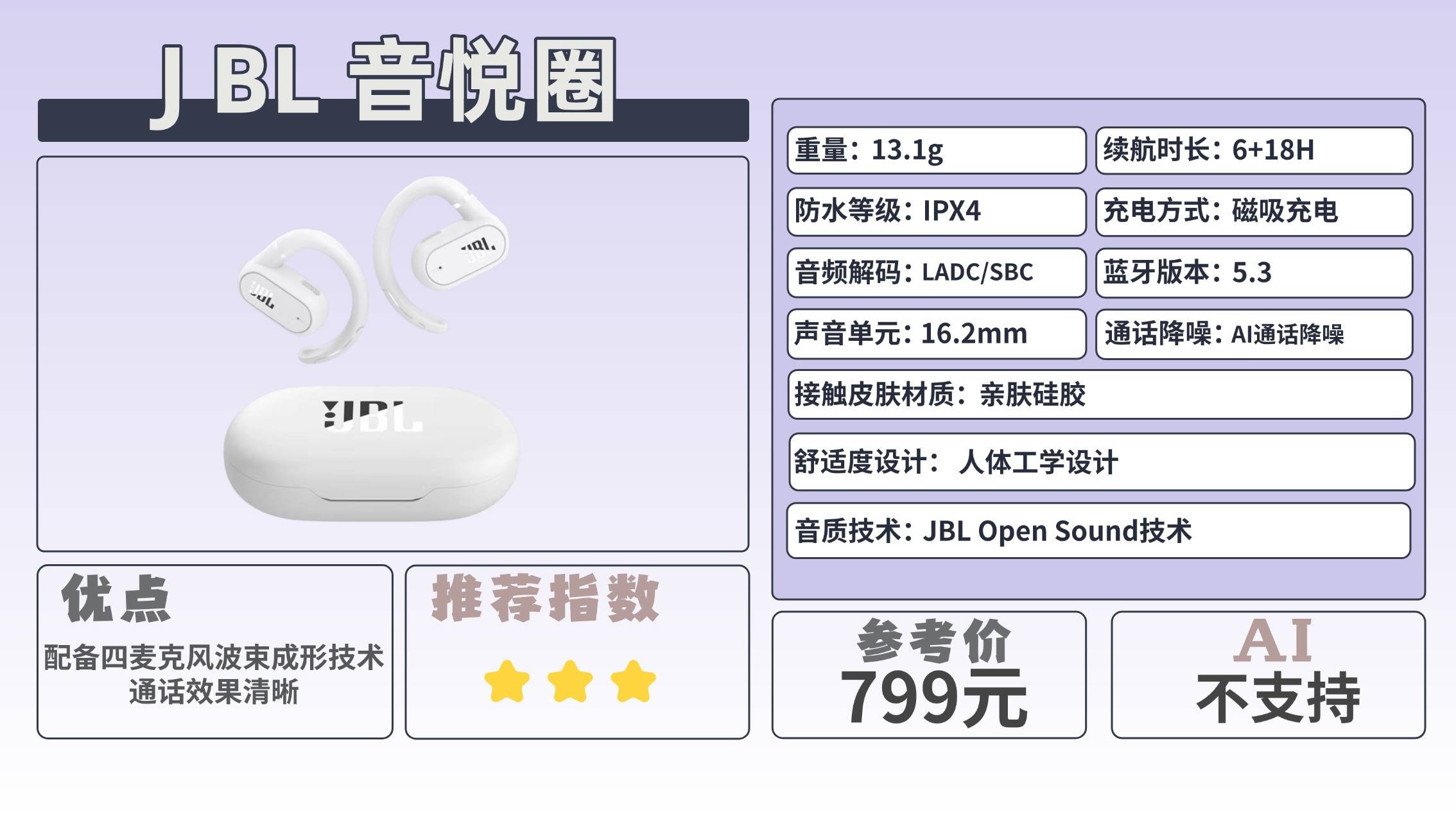 同时,耳机运用了JBL开放式定向声场技术,即使在嘈杂环境下也能有效控制声音传播方向,减少漏音现象,更好地维护听音隐私。续航能力上,单次充电可提供约6小时的连续播放,配合充电盒使用总续航可达24小时,足以应对全天的使用需求。