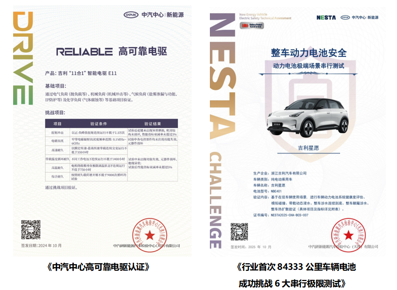 吉利星愿搭载行业首款11合1智能电驱,在功能高度集成的同时,还拥有同级领先的89.2%电驱效率,实现了同级最小的66L体积,将节省的空间以超大后备箱的形式还给了用户。通过了3000小时的台架耐久和200万公里的真实路试,星愿电驱完成了浸水工作、高温耐久、电磁抗扰、扭矩冲击、机械冲击等7大高难度挑战,获得了中汽研《高可靠电驱》的认证。