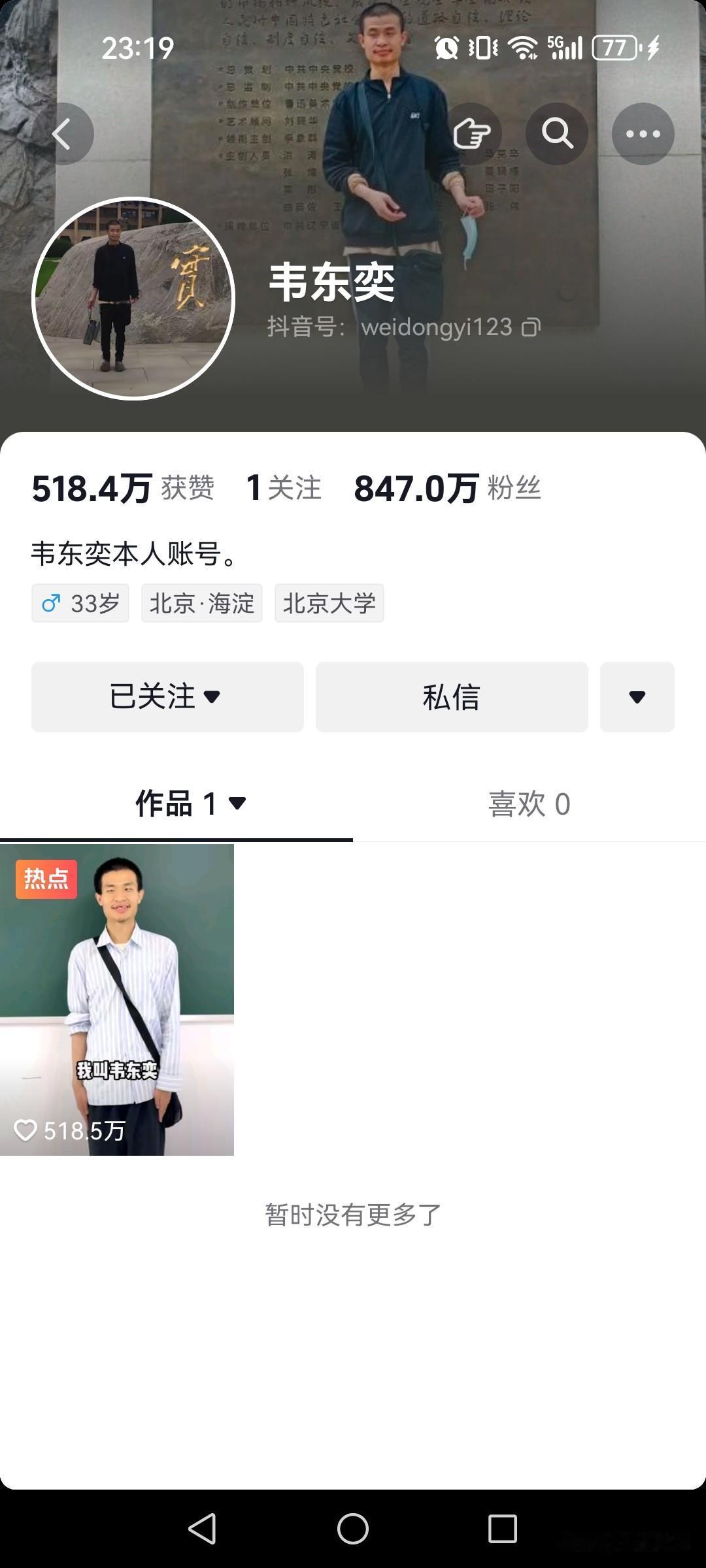 这真是超级顶流,自带光环! 今天上午我看网上说韦神韦东奕在抖音开账号了,于是就过去看了下,当时只有十几万粉丝。刚才又去看了下,好家伙,粉丝已经高达847万了,点赞量518万,留言55.4万,收藏18.5万,转发134.3万。 韦神一共就说了十四个字,粉丝蹭蹭往上涨,不出意外,明天一觉醒来肯定超过千万了,这才是真正的顶流。 韦神不善言辞,但却是数学天才,希望通过抖音平台分享数学知识,一展风采,顺便找到心仪的女神!