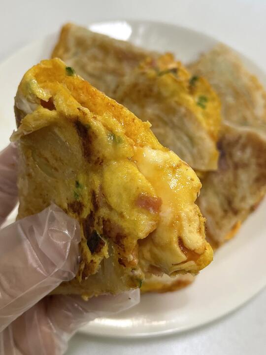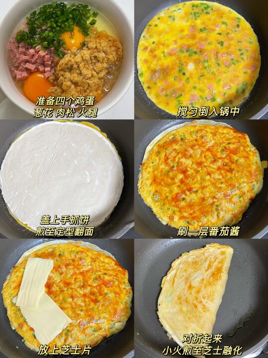 手抓饼的王炸吃法!葱香肉松火腿饼!! 外皮酥脆 芝士还爆浆! 咸香可口 口感超丰富~ 不知道早餐吃什么的赶紧去做!步骤如图⬆️