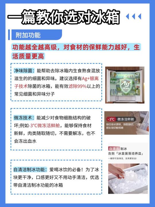 制冰功能:建议选择自清洁制冰功能的冰箱,不仅不需要手动清洁,还能保证冰块洁净,口感更好