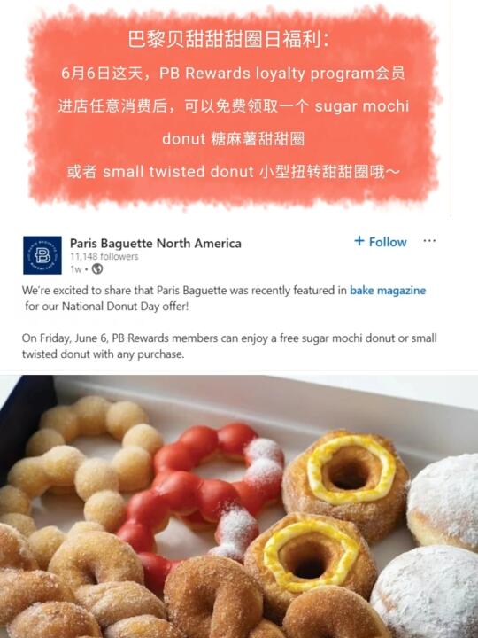 今年新加入“全美甜甜圈日”!巴黎贝甜于1988年成立,是来自韩国的顶 级 烘焙品牌。目前在全球已有3700多家门店,因为用料好、口感清甜不腻,适合亚洲人的口味而闻名纽约,连锁开满了全纽约!