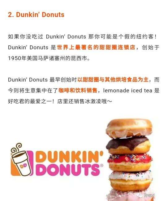 世界上zui著名的甜甜圈连锁店,创始于1950年美国马萨诸塞州的昆西市。早期创始时以甜甜圈与其他烘培食品为主,而今则将生意集中在了咖啡和饮料销售lemonade iced tea 是好吃君的超爱!店里还销售冰激凌哦~