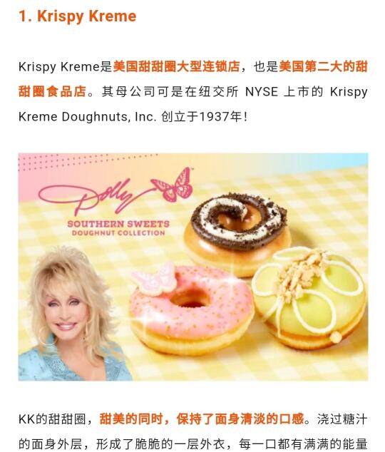 美国第2大的甜甜圈连锁,创立于1937年。KK的甜甜圈,甜美的同时,保持了面身清淡的口感。浇过糖汁的面身外层,形成了脆脆的一层外衣,每一口都有满满的能量感