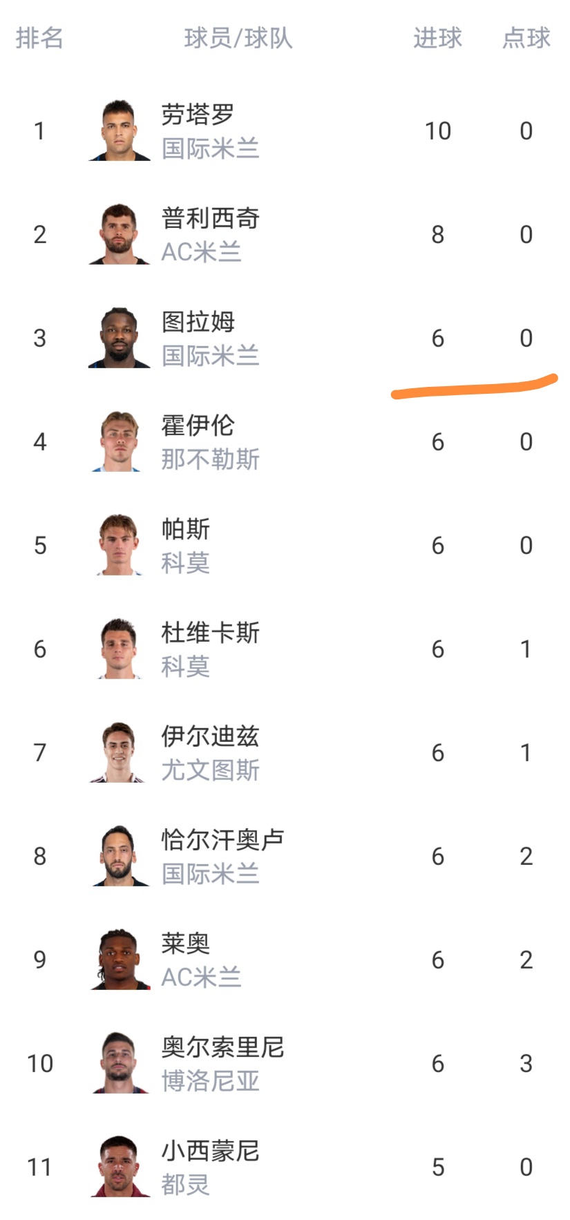 射手榜:图拉姆今天进球之后,已经是6球来到了第三,可以看到射手榜前十有三名国际米兰的球员,可见国米本赛季进攻火力更强大。