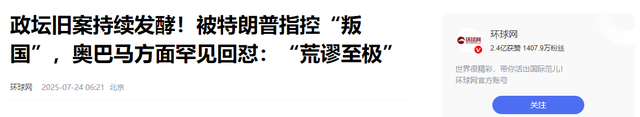 环球网:政坛旧案持续发酵!被特朗普指控“叛国”,奥巴马方面罕见回怼:“荒谬至极” 2025-07-24