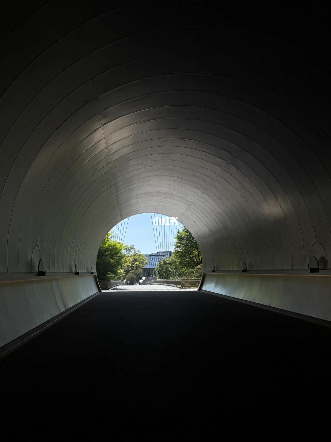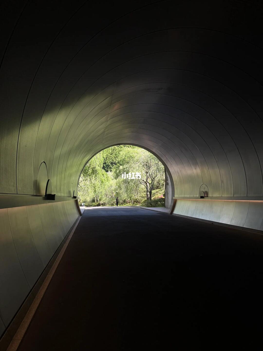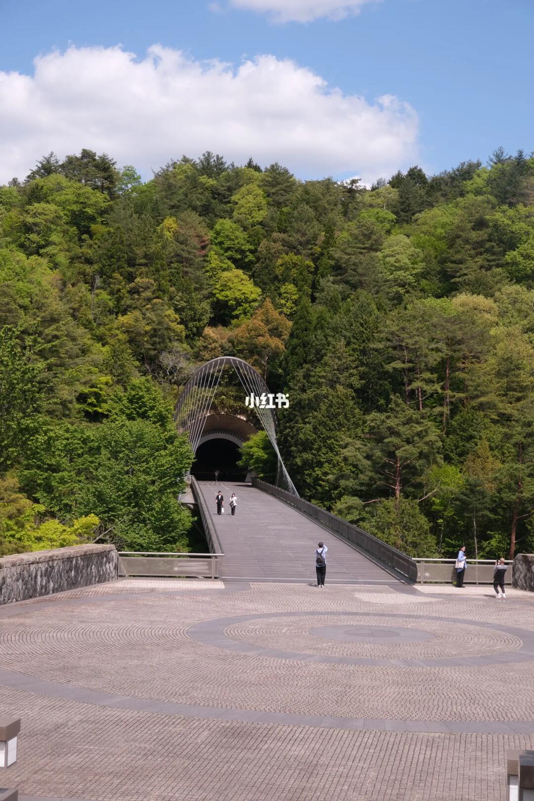 抵达主馆要通过一条300米长的山体隧道,走出洞口后是悬空吊桥,脚下是潺潺溪流,山谷间草木繁盛。春天是垂枝樱花林,每年3月底到4月中是花期,夏天则是葱郁绿色,秋天还有缤纷红叶。整趟路就像走进现实版的《桃花源记》,“初极狭,才通人;复行数十步,豁然开朗。”