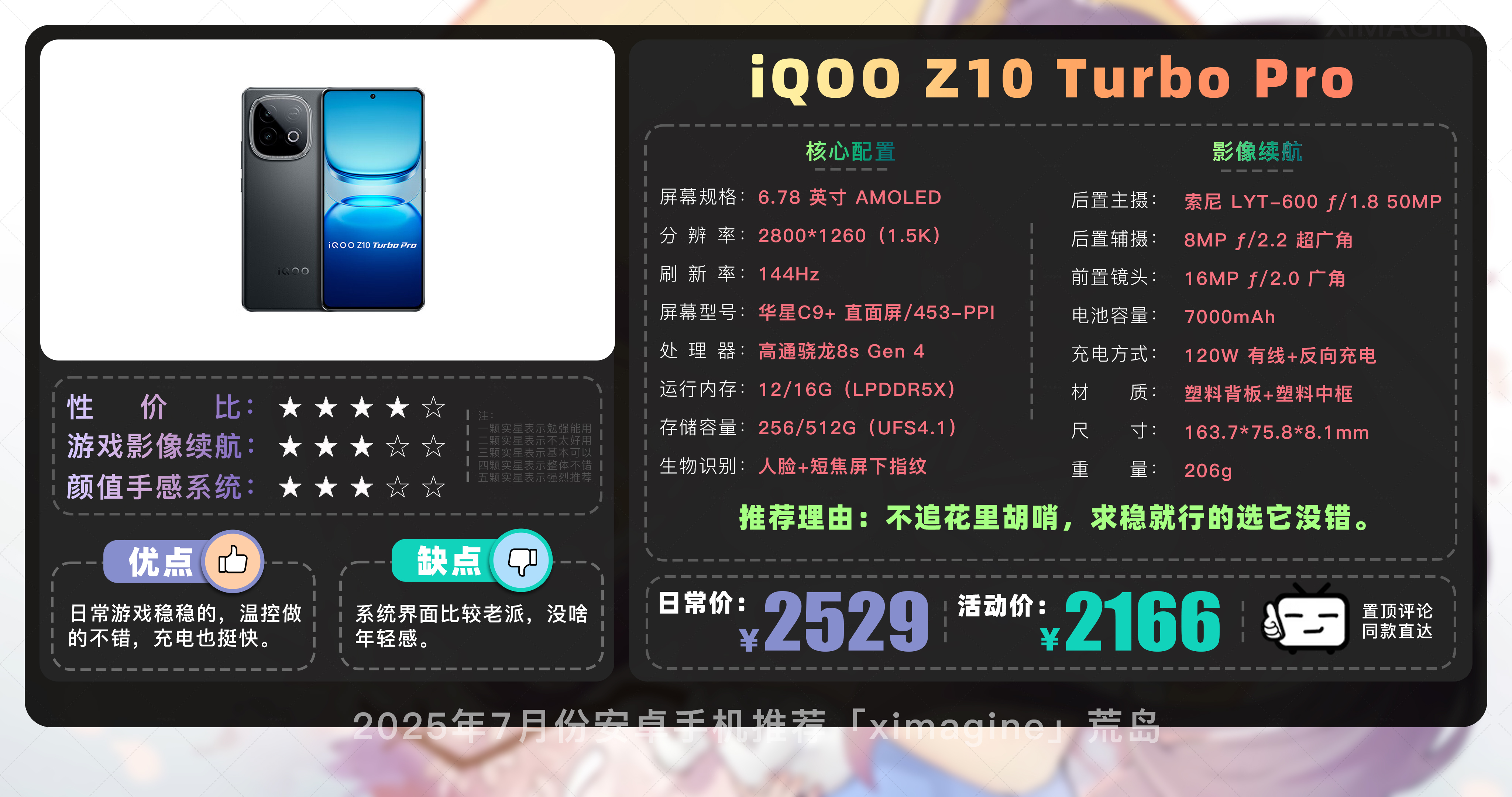 iQOO Z10 Turbo Pro,第四代骁龙8s在日常游戏体验中表现稳定,手机温控做得不错,长时间游戏手感依然舒适,不会烫手影响发挥。120W的有线充电速度快,适合经常忙碌但又喜欢碎片时间玩游戏的用户。虽然系统界面设计偏传统,缺少一些新潮元素,但整体操作流畅,能快速上手。索尼LYT-600摄像头表现一般,日常拍摄足够满足朋友圈分享,但不要期待太多专业级效果。206g机身手感中规中矩重量适中,单手操作不吃力。当前活动价 2166 元,追求实用性的用户可以冲。