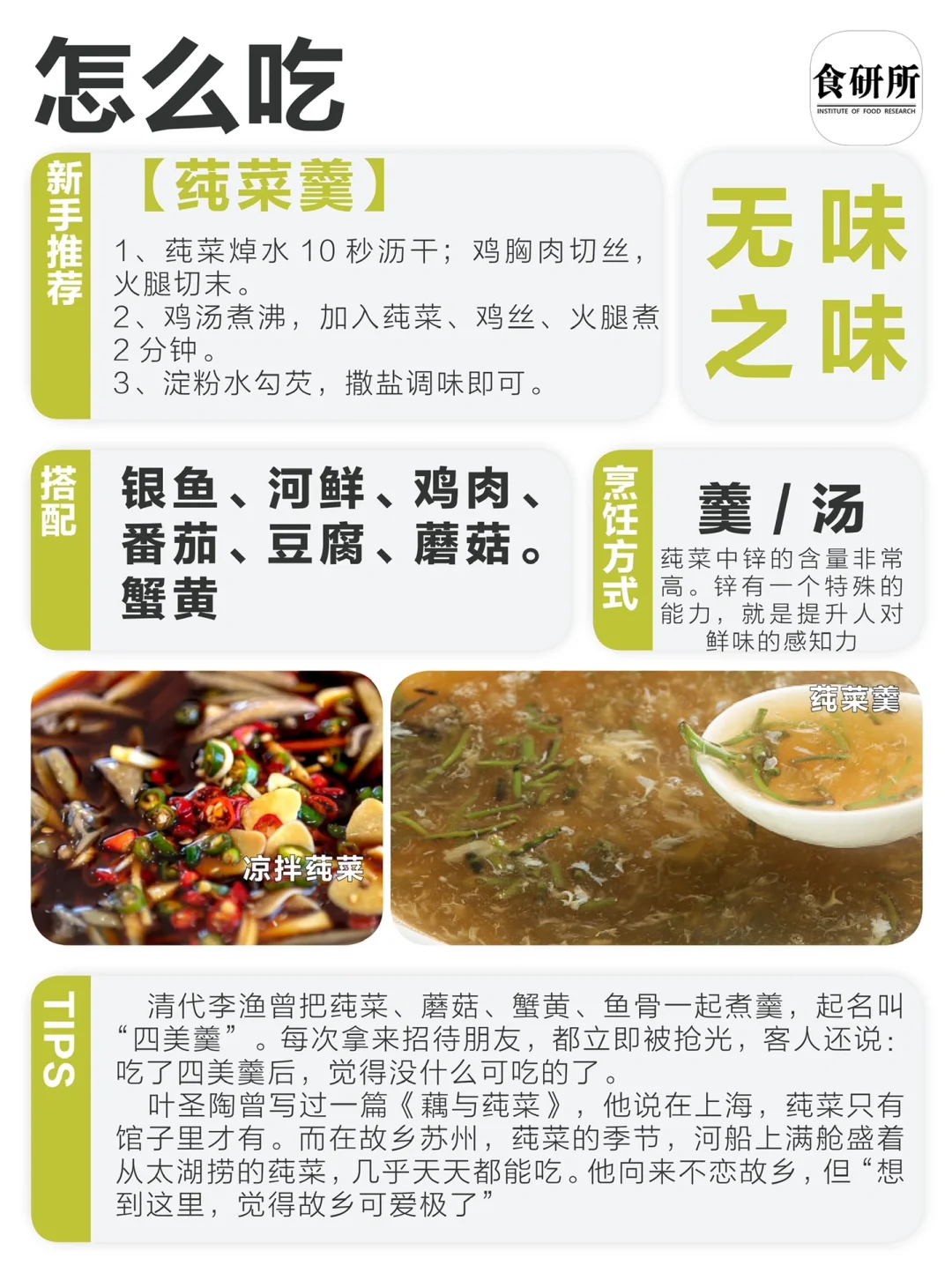 [飞机R]莼菜一般都是和鱼、河鲜一起烹制的,比如著名的“西湖莼菜羹”、“莼菜汆塘鱼”这是因为莼菜中锌的含量非常高。锌有一个特殊的能力,就是提升人对鲜味的感知力