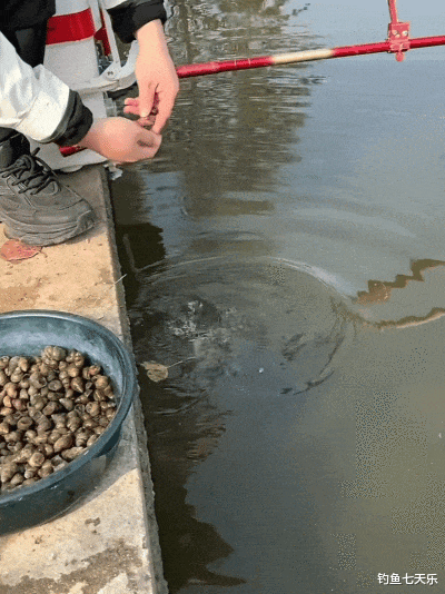 这让钓鱼男子有点懵,随手又拿起打窝勺,弄了十几个螺蛳放到鱼嘴里,没想到大鲤鱼一口将十几个螺蛳给吞掉了。