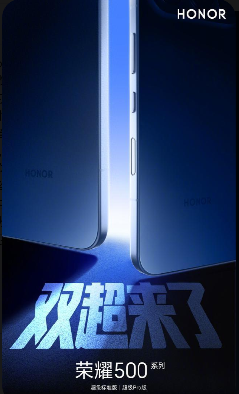 荣耀500Pro官方宣传海报,展示双机对称设计与科技感光影效果