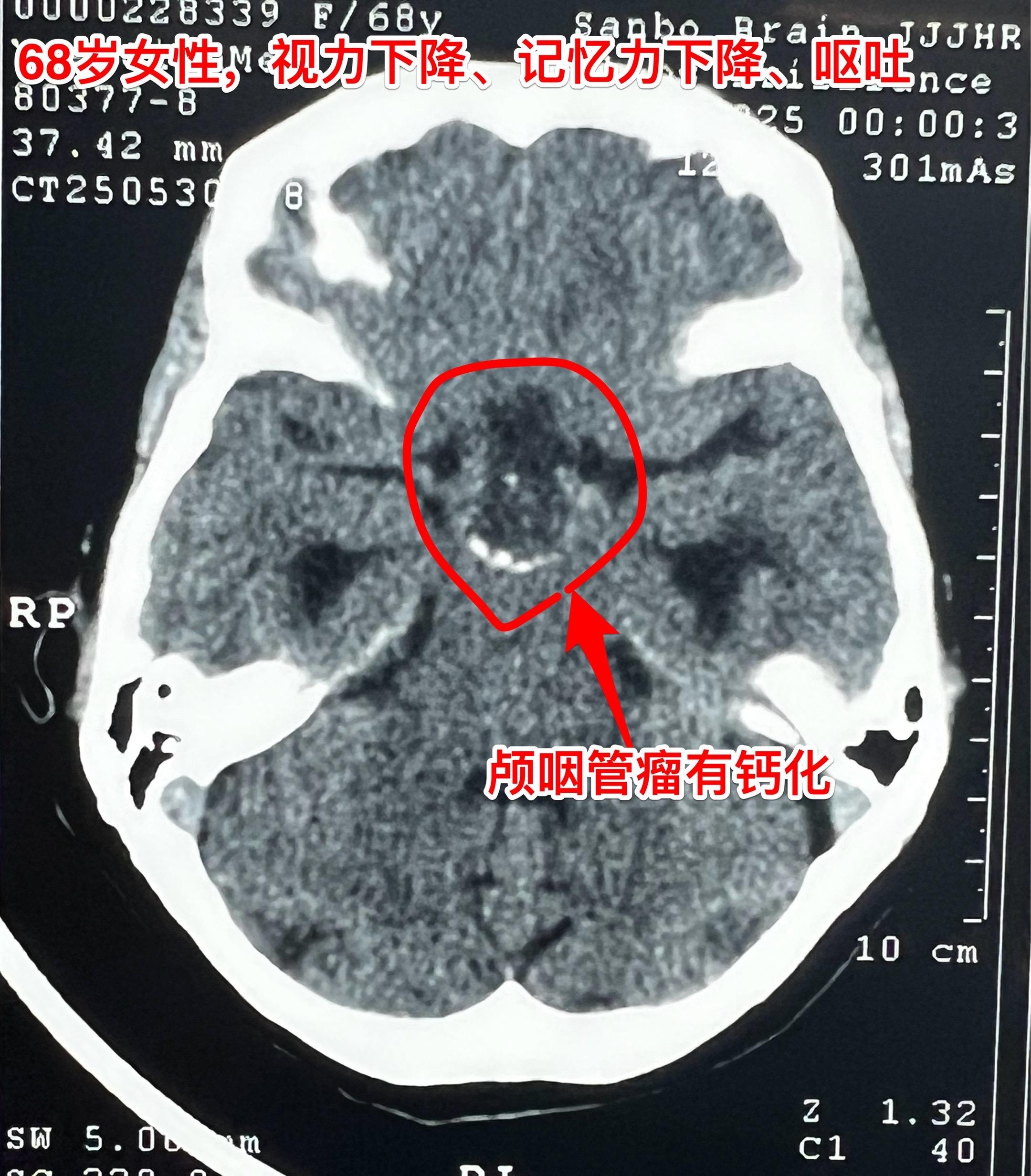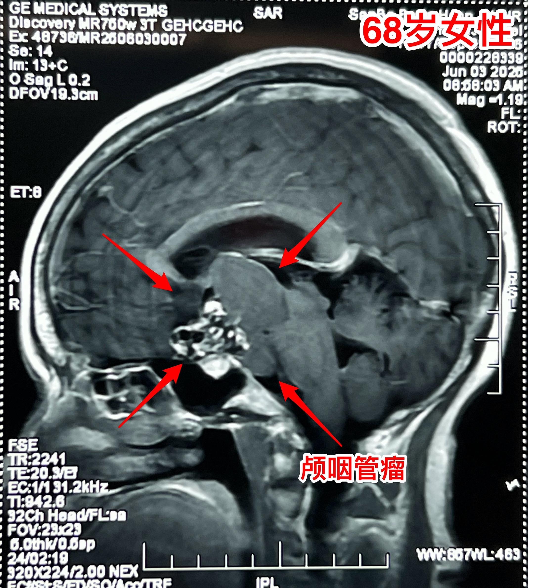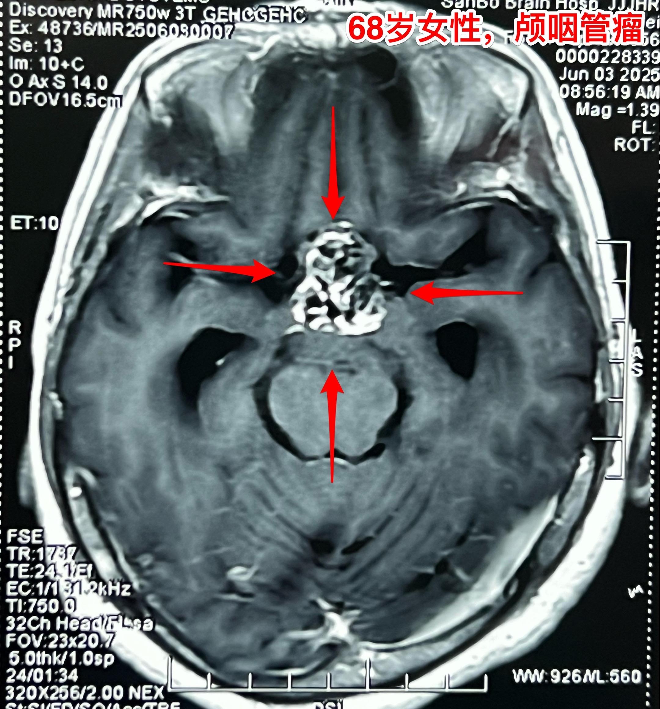 68岁老人患颅咽管瘤是否可以作手术? 颅咽管瘤并非小孩子的病,老年人也可以患颅咽管瘤。 过去十年间我科治疗过颅咽管瘤患者共计1153例次,其中53例患者年龄在60-74岁。 所以,老年人患颅咽管瘤也不是手术禁忌。 这个68岁南通市女病人因颅咽管瘤造成视力下降、头晕症状,住院前一天出现反复呕吐症状,提示颅内压升高,所以应该尽早作手术,否则会造成生命危险。2025年6月8日作了开颅手术,颅咽管瘤得到完全切除。幸运的是垂体柄受肿瘤侵蚀的不严重,得以保留。今天是手术后第