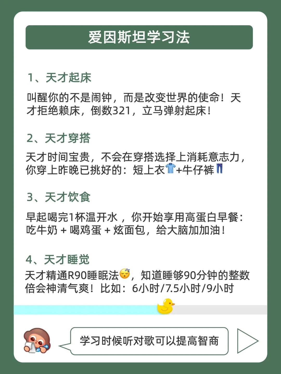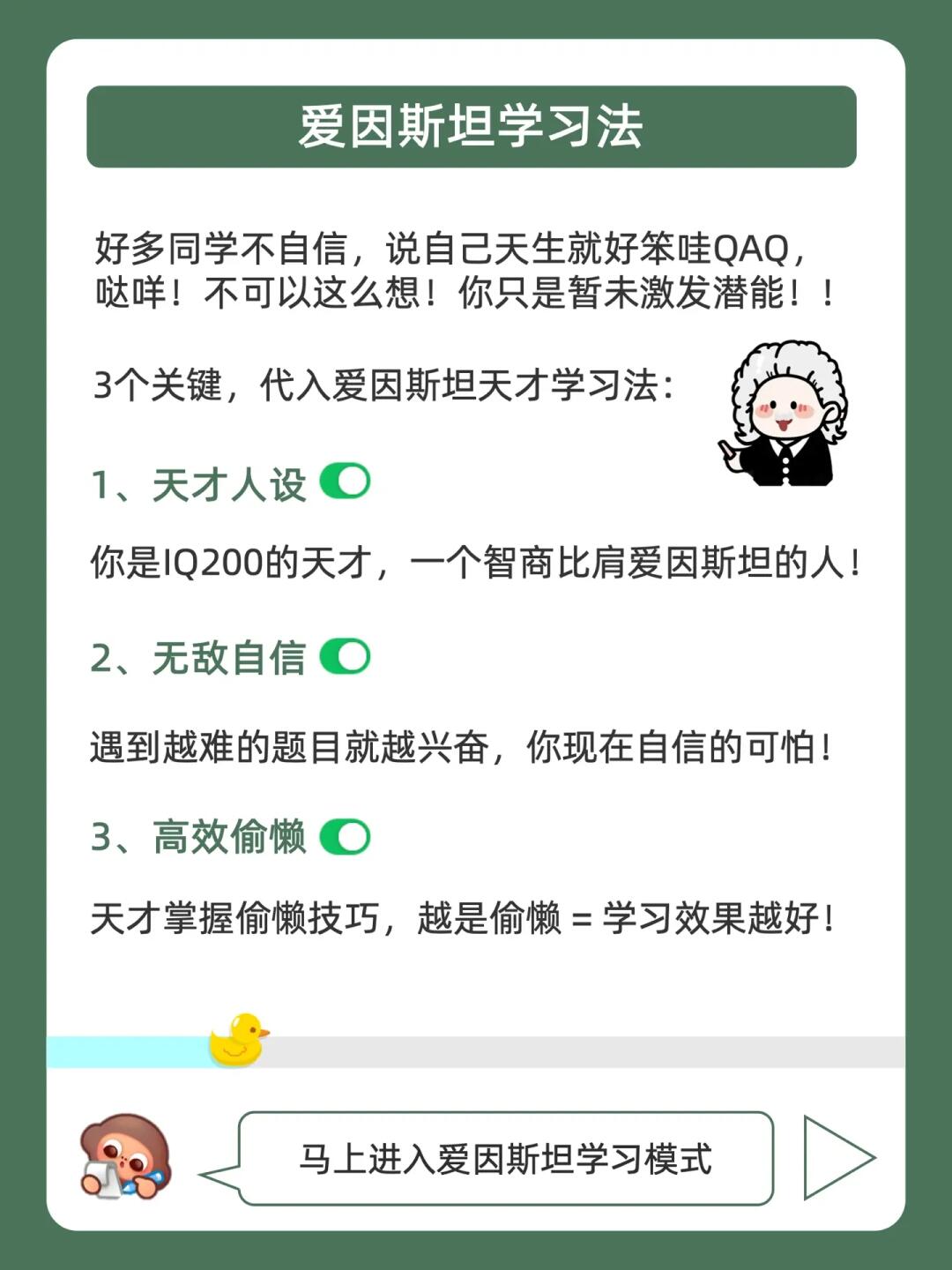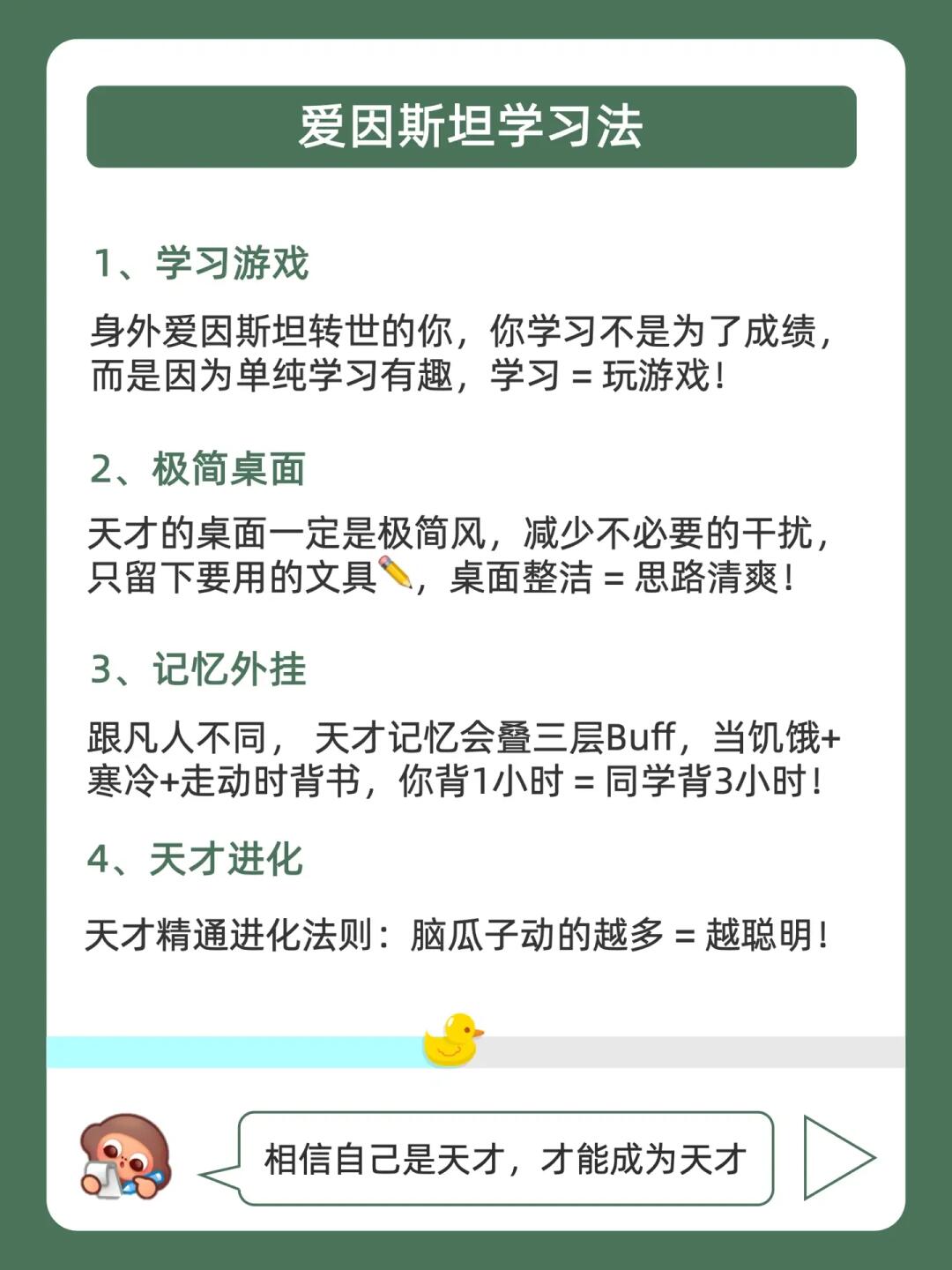 · [赞R]学习摆烂不用怕,鸭鸭带你做卷王❗️ · [哇R]拿下爱因斯坦学习法,变身天才就在于此!🚀 . [偷笑R]赶紧学起来,这可是天才间不轻易透露的秘密❗ . 🐣我是鸭鸭,持续分享更多优质学习方法,陪宝子们快乐学习,驰骋学海!🌊