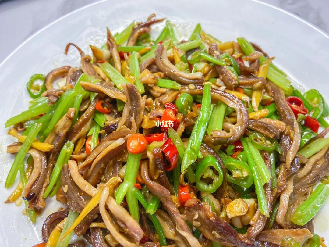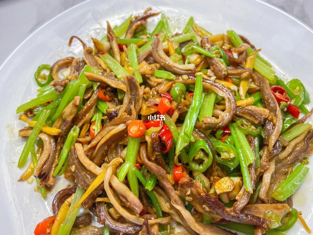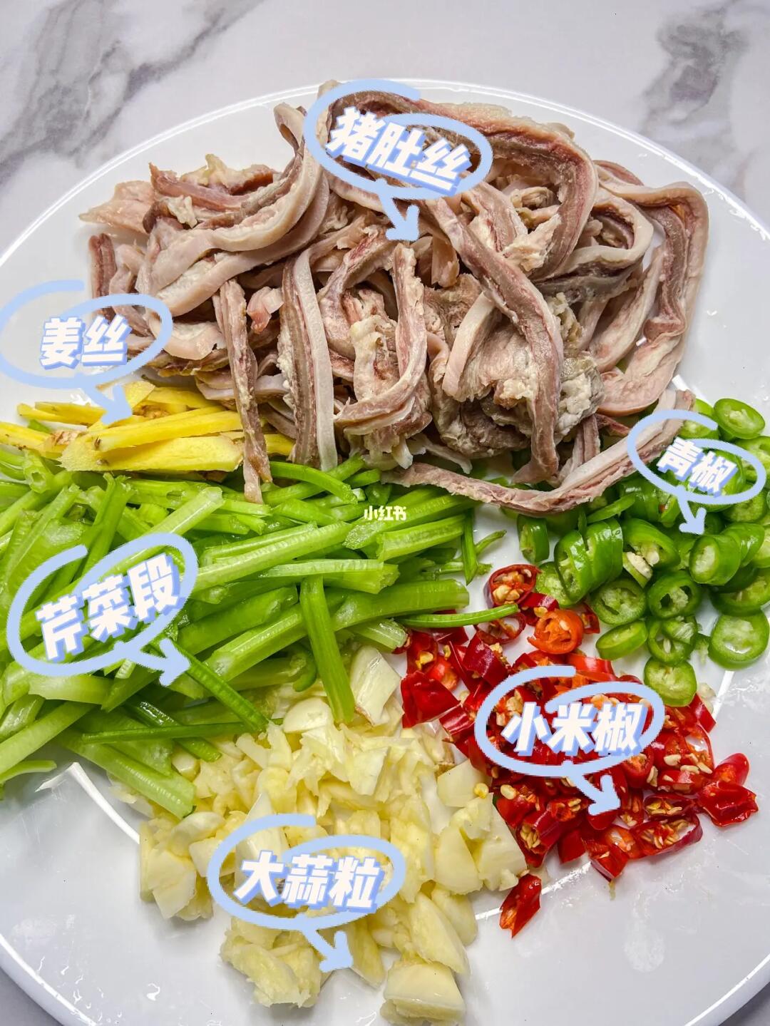 平日里大家的猪肚都是用来煲汤的吧!年夜饭上换一个花样,换个口味吧! ✨✨✨✨✨✨ 食材: 姜、蒜、小米辣、青椒、猪肚丝 ✨✨✨✨✨✨ 做法: 1.热锅下油爆姜蒜 2.倒入猪丝煸炒出香味 3.加入适量的盐和鸡粉、生抽、老抽各少许 4.倒少辣椒和芹菜段,炒出香味装盘。