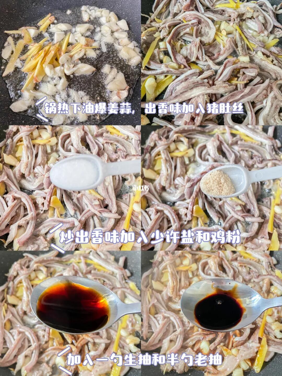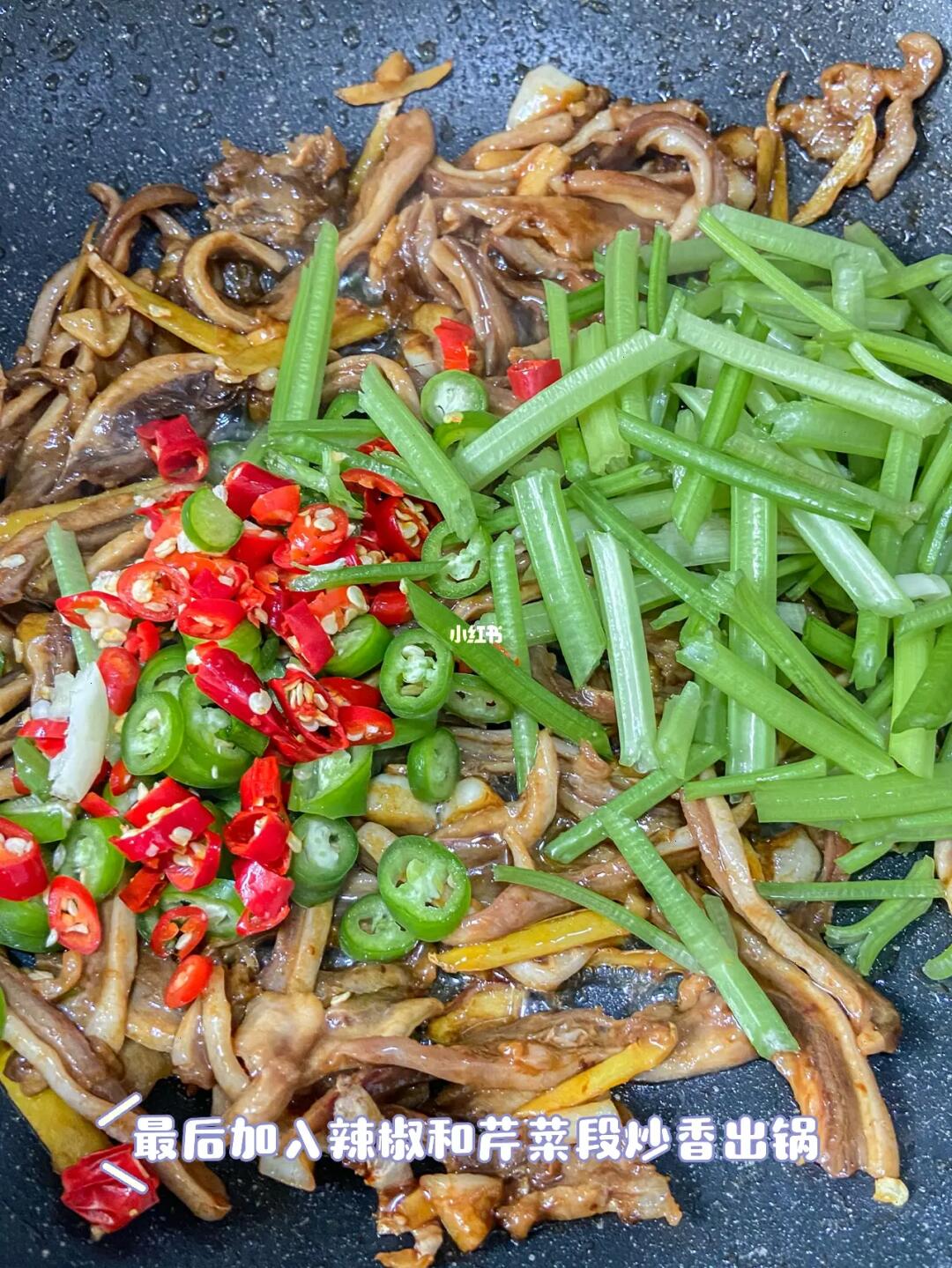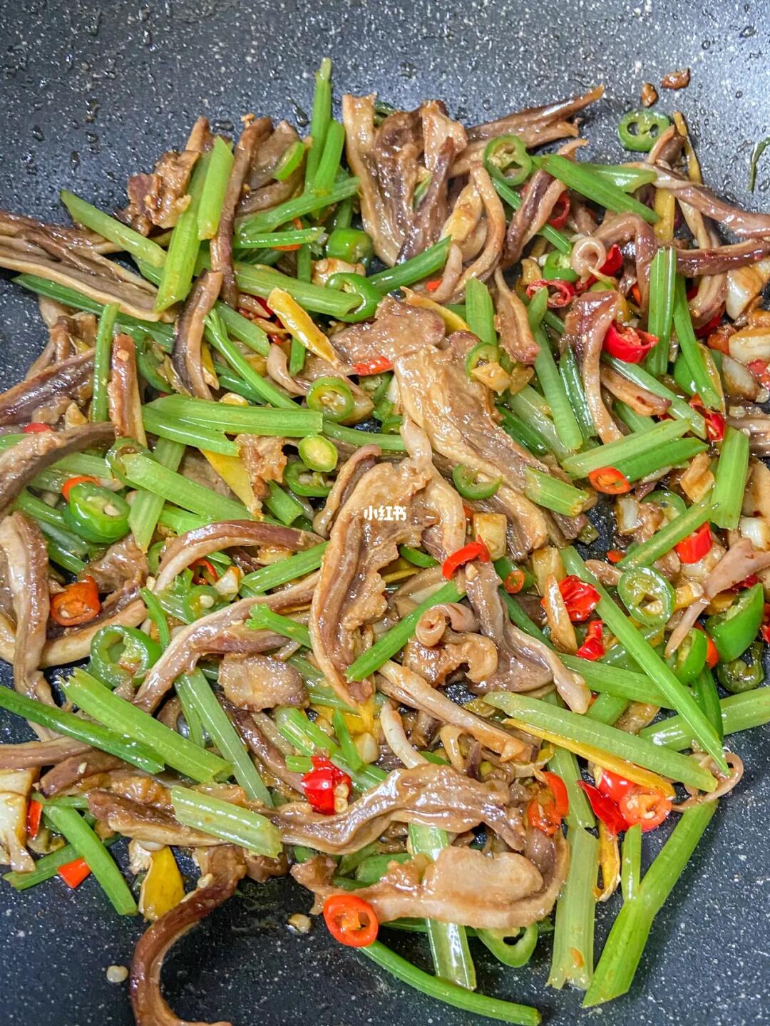 平日里大家的猪肚都是用来煲汤的吧!年夜饭上换一个花样,换个口味吧! ✨✨✨✨✨✨ 食材: 姜、蒜、小米辣、青椒、猪肚丝 ✨✨✨✨✨✨ 做法: 1.热锅下油爆姜蒜 2.倒入猪丝煸炒出香味 3.加入适量的盐和鸡粉、生抽、老抽各少许 4.倒少辣椒和芹菜段,炒出香味装盘。