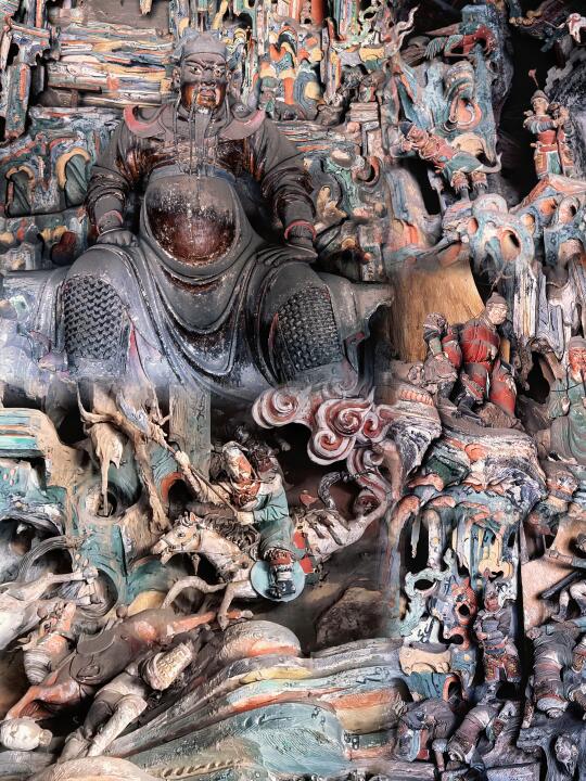 在迦蓝殿遇到一对情侣,听到他们在讨论雕塑人物,忍不住告知了一下几个片段分别在哪儿,桃园结义,怒斩华雄,斩蔡阳,破黄巾兵,水淹七军~