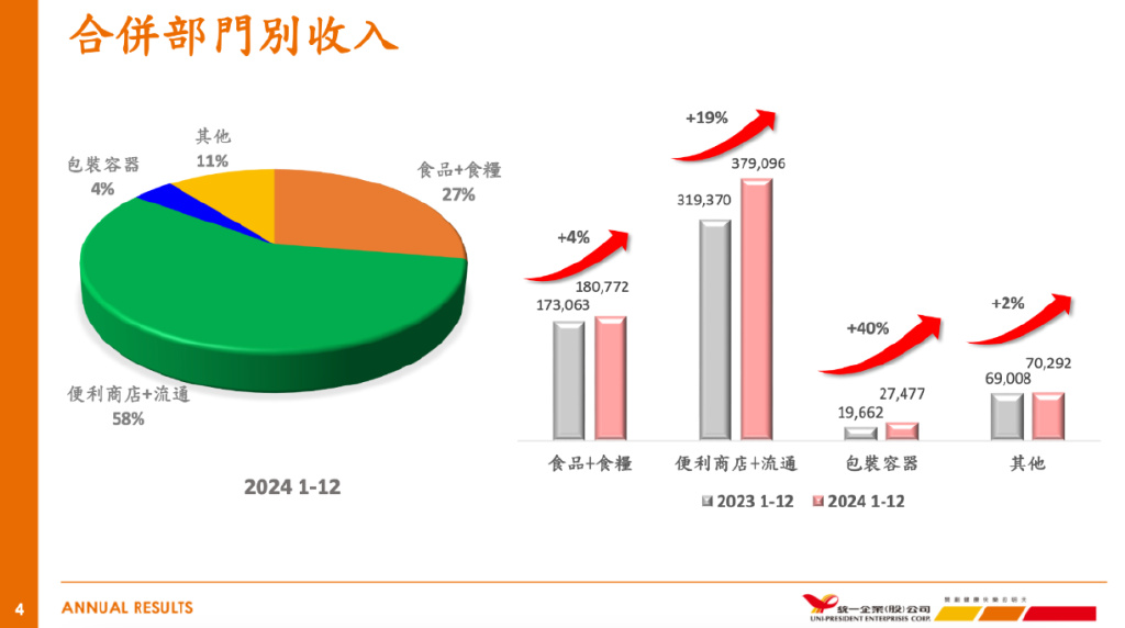 2024年,统一合并营收为6576亿新台币(约合人民币1597亿元),其中58%来自便利商店与流通板块。该板块收入主要来自统一超商,后者去年合并营收为新台币3379亿元(约合人民币821亿元)。