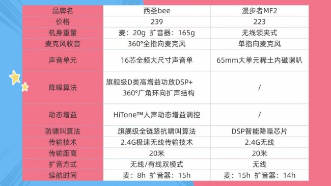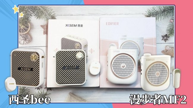 ▪外观设计:漫步者MF2采用轻量化便携机身设计,搭配简约耐看的配色,整体造型利落大方,日常携带、佩戴使用都无负担,无论是教学、带团还是门店使用,放置收纳都简洁美观,兼顾实用性与视觉质感。▪配置硬件:这款扩音器搭载无线领夹式传输设计,配备单指向麦克风,搭配65mm大单元稀土内磁喇叭,硬件配置扎实,能够稳定拾取人声,同时保障声音输出的基础响度与传播效果,满足基础场景的扩音需求。适用人群:追求简约便携、看重基础扩音功能,偏爱常规硬件配置的日常使用人群。Part②小蜜蜂扩音器核心参数表在了解西圣Bee与漫步者MF2两大品牌及机型基本情况后,我还为大家整理了两款小蜜蜂扩音器的核心参数表,客观呈现产品关键参数信息,以下是具体的参数对比详情。