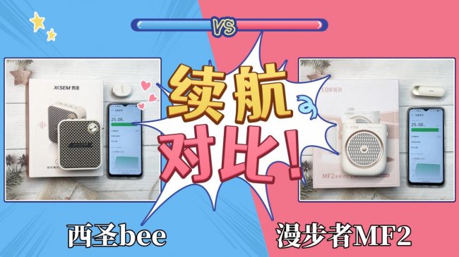 续航实测对比西圣Bee在本次续航实测中表现非常不错!整机续航分配合理,长时间连续工作也能保持稳定供电,整体续航与用电体验都十分出色。它麦克风8小时、扩音器15小时的续航搭配,再加上专属智能省电优化和快充功能加持,从硬件到功耗调校都做了全面适配,日常长时间连续扩音、外出无电源场景使用都能从容应对,不用频繁惦记充电,临时电量不足也能快速补电恢复使用。漫步者MF2在实测中可以维持基础均衡的续航表现,配备麦克风15小时、扩音器14小时的常规续航规格,没有额外的智能省电与快充设计,整体属于够用稳妥的水平。