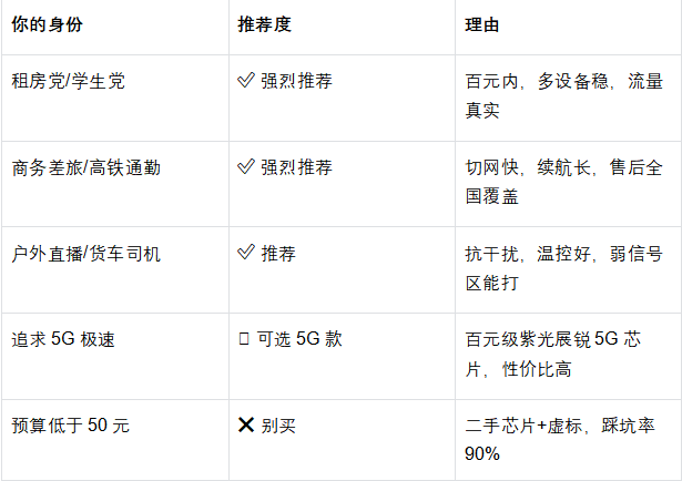 2️⃣ 不追峰值追稳定👉 宣称150Mbps没意义,关键看高铁/地下室断不断。👉 选“三网全频段+智能切网”。