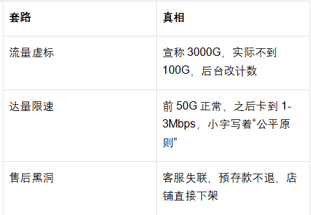 - 流量虚标?1500G到手不到500G。- 偷偷限速?月初飞快,月中卡成2G。- 售后跑路?设备坏了,商家比你先消失。