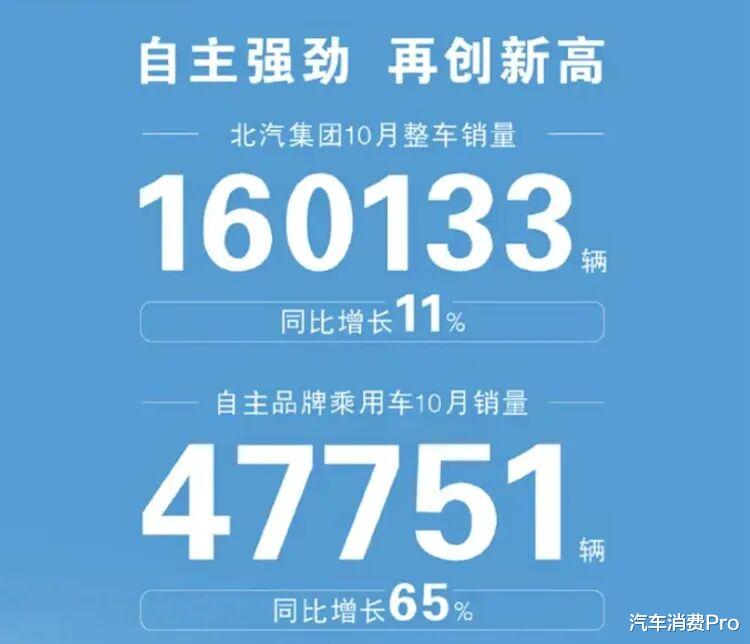 北汽集团10月整车销量160133辆,同比增长11%;自主品牌乘用车10月销量47751辆,同比增长65%。具体品牌方面,极狐品牌10月份销量为23387辆,同比增长110%;享界品牌10月份销量为6700辆;北京越野10月销量为17664辆,这其中硬派越野系列10月销量为9261辆,同比增长167%。