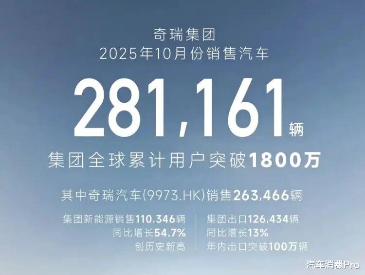 根据奇瑞发布的官方数据来看,奇瑞集团10月份销售汽车281161辆,同比增长3.3%,奇瑞汽车10月份销售263466辆,其中新能源突破11万辆,达到110346辆,出口126434辆,今年累计出口1062862辆。奇瑞品牌10月份销售169696辆;捷途品牌10月份销售59073辆;星途品牌10月份销售9494辆;iCAR品牌10月份销售12393辆;智界品牌10月份销售12810辆。