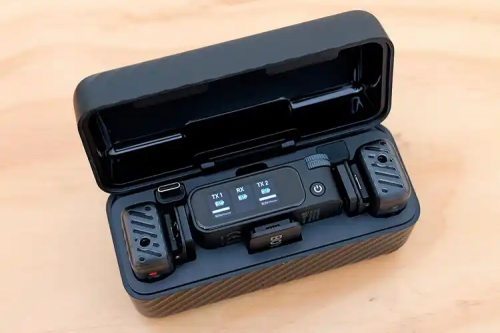 发射器重23克,配有背夹和磁吸片,可轻松固定在衣领或吸附在衣物上,佩戴舒适且稳固。接收器带有高分辨率OLED屏幕,参数显示清晰直观。四合一转接器设计,搭配多种接口线,可全面适配手机、相机、电脑等设备,即插即用。不过,充电盒体积相对较大,携带时可能会占用一定空间。