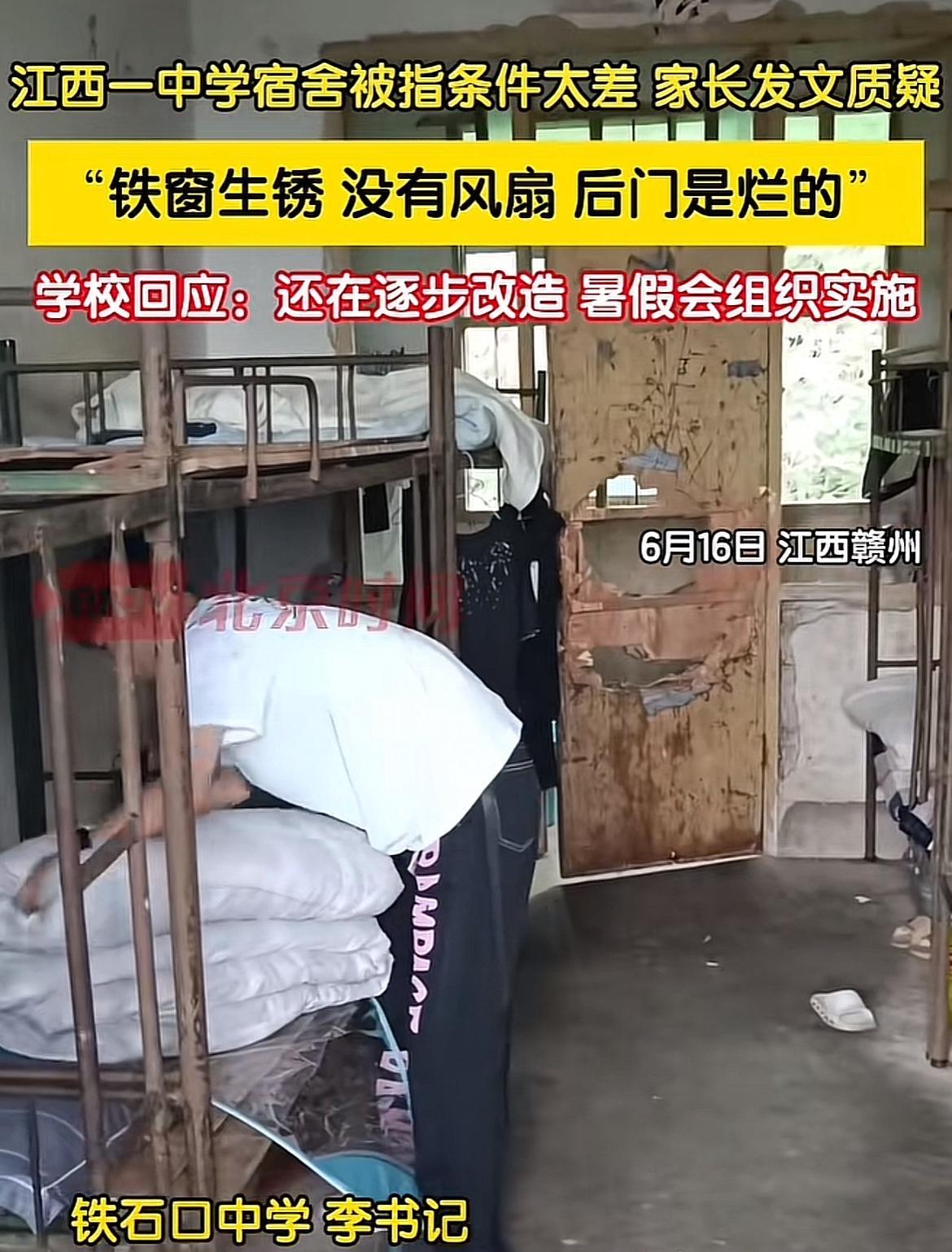江西一中学宿舍铁床生锈木门破烂?教体局:正在调查 6月16日,有网友在社交平台发视频称,江西赣州信丰县铁石口中学学生宿舍环境较差,铁床生锈,床板和门是烂的,此事引发关注。 网友发布的视频显示,该宿舍内有6张床架子,可以看到铁床栏杆已生锈,部分墙皮脱落,木门也烂了几个洞。有从该校毕业多年的当地人告诉记者,该校宿舍十几年前就是这个样子,“床和门可能都没换过。” 据荔枝新闻报道,铁石口中学工作人员表示,宿舍条件确实比较差,县里已经把宿舍纳入了今年的改造计划,暑假就准备实施了。 6月16日下午,信丰县教育体育局工作人员告诉极目新闻记者,他们关注到了此事,正在调查处理。