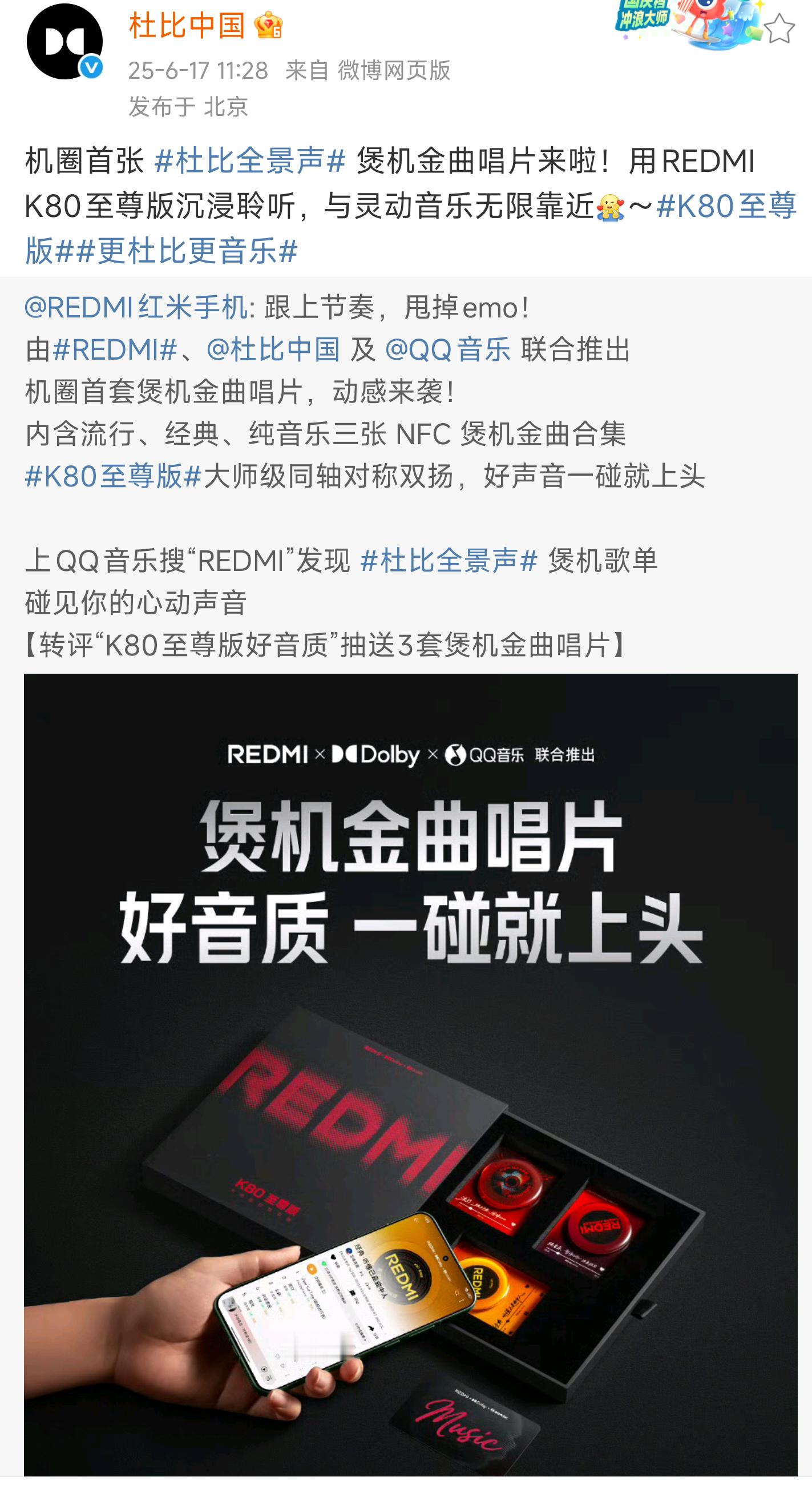 红米K80至尊版音乐手机,大师级同轴对称双扬,还联合推出了杜比全景煲机金曲。[馋嘴][馋嘴]